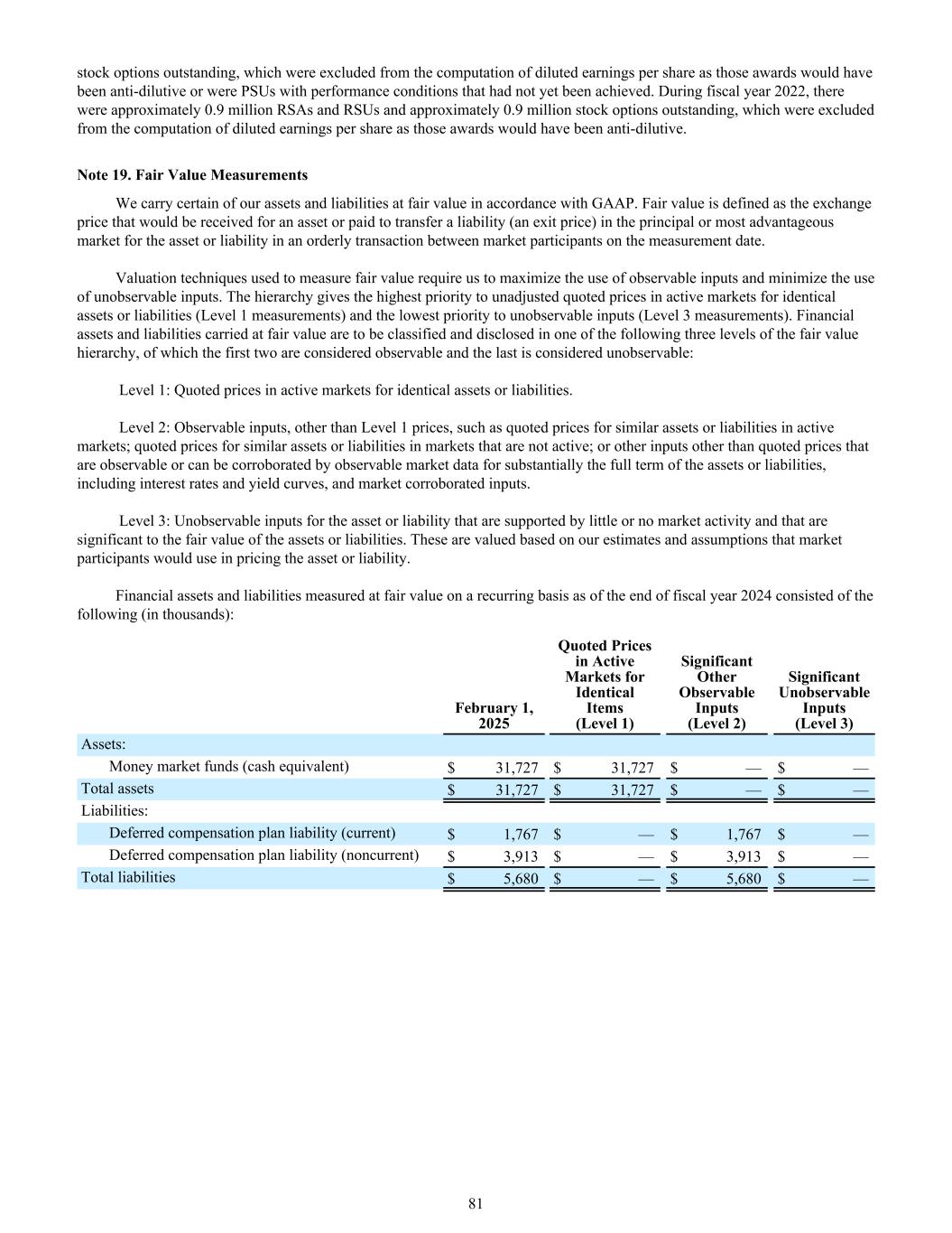 stock options outstanding, which were excluded from the computation of diluted earnings per share as those awards would have been anti-dilutive or were PSUs with performance conditions that had not yet been achieved. During fiscal year 2022, there were approximately 0.9 million RSAs and RSUs and approximately 0.9 million stock options outstanding, which were excluded from the computation of diluted earnings per share as those awards would have been anti-dilutive. Note 19. Fair Value Measurements We carry certain of our assets and liabilities at fair value in accordance with GAAP. Fair value is defined as the exchange price that would be received for an asset or paid to transfer a liability (an exit price) in the principal or most advantageous market for the asset or liability in an orderly transaction between market participants on the measurement date. Valuation techniques used to measure fair value require us to maximize the use of observable inputs and minimize the use of unobservable inputs. The hierarchy gives the highest priority to unadjusted quoted prices in active markets for identical assets or liabilities (Level 1 measurements) and the lowest priority to unobservable inputs (Level 3 measurements). Financial assets and liabilities carried at fair value are to be classified and disclosed in one of the following three levels of the fair value hierarchy, of which the first two are considered observable and the last is considered unobservable: Level 1: Quoted prices in active markets for identical assets or liabilities. Level 2: Observable inputs, other than Level 1 prices, such as quoted prices for similar assets or liabilities in active markets; quoted prices for similar assets or liabilities in markets that are not active; or other inputs other than quoted prices that are observable or can be corroborated by observable market data for substantially the full term of the assets or liabilities, including interest rates and yield curves, and market corroborated inputs. Level 3: Unobservable inputs for the asset or liability that are supported by little or no market activity and that are significant to the fair value of the assets or liabilities. These are valued based on our estimates and assumptions that market participants would use in pricing the asset or liability. Financial assets and liabilities measured at fair value on a recurring basis as of the end of fiscal year 2024 consisted of the following (in thousands): February 1, 2025 Quoted Prices in Active Markets for Identical Items (Level 1) Significant Other Observable Inputs (Level 2) Significant Unobservable Inputs (Level 3) Assets: Money market funds (cash equivalent) $ 31,727 $ 31,727 $ — $ — Total assets $ 31,727 $ 31,727 $ — $ — Liabilities: Deferred compensation plan liability (current) $ 1,767 $ — $ 1,767 $ — Deferred compensation plan liability (noncurrent) $ 3,913 $ — $ 3,913 $ — Total liabilities $ 5,680 $ — $ 5,680 $ — 81
