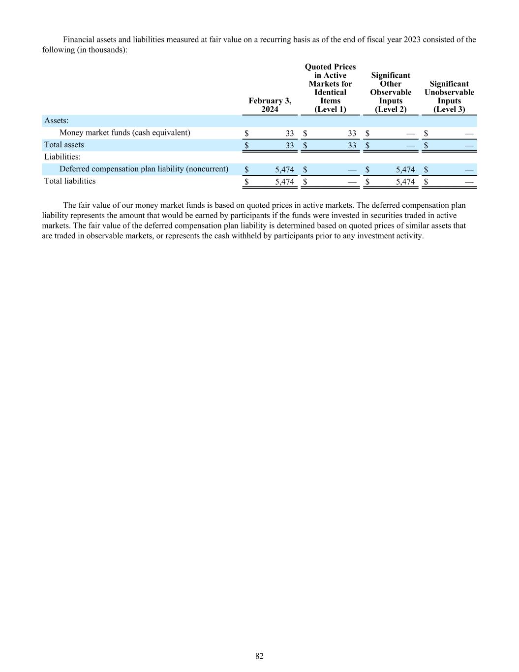 Financial assets and liabilities measured at fair value on a recurring basis as of the end of fiscal year 2023 consisted of the following (in thousands): February 3, 2024 Quoted Prices in Active Markets for Identical Items (Level 1) Significant Other Observable Inputs (Level 2) Significant Unobservable Inputs (Level 3) Assets: Money market funds (cash equivalent) $ 33 $ 33 $ — $ — Total assets $ 33 $ 33 $ — $ — Liabilities: Deferred compensation plan liability (noncurrent) $ 5,474 $ — $ 5,474 $ — Total liabilities $ 5,474 $ — $ 5,474 $ — The fair value of our money market funds is based on quoted prices in active markets. The deferred compensation plan liability represents the amount that would be earned by participants if the funds were invested in securities traded in active markets. The fair value of the deferred compensation plan liability is determined based on quoted prices of similar assets that are traded in observable markets, or represents the cash withheld by participants prior to any investment activity. 82