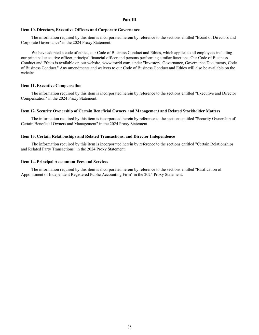 Part III Item 10. Directors, Executive Officers and Corporate Governance The information required by this item is incorporated herein by reference to the sections entitled "Board of Directors and Corporate Governance" in the 2024 Proxy Statement. We have adopted a code of ethics, our Code of Business Conduct and Ethics, which applies to all employees including our principal executive officer, principal financial officer and persons performing similar functions. Our Code of Business Conduct and Ethics is available on our website, www.torrid.com, under "Investors, Governance, Governance Documents, Code of Business Conduct." Any amendments and waivers to our Code of Business Conduct and Ethics will also be available on the website. Item 11. Executive Compensation The information required by this item is incorporated herein by reference to the sections entitled "Executive and Director Compensation" in the 2024 Proxy Statement. Item 12. Security Ownership of Certain Beneficial Owners and Management and Related Stockholder Matters The information required by this item is incorporated herein by reference to the sections entitled "Security Ownership of Certain Beneficial Owners and Management" in the 2024 Proxy Statement. Item 13. Certain Relationships and Related Transactions, and Director Independence The information required by this item is incorporated herein by reference to the sections entitled "Certain Relationships and Related Party Transactions" in the 2024 Proxy Statement. Item 14. Principal Accountant Fees and Services The information required by this item is incorporated herein by reference to the sections entitled "Ratification of Appointment of Independent Registered Public Accounting Firm" in the 2024 Proxy Statement. 85