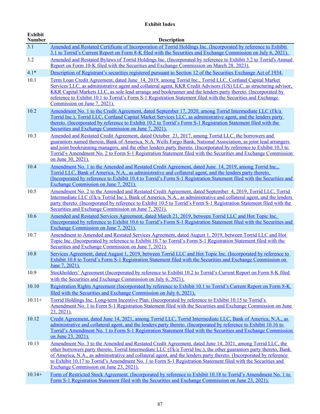 Exhibit Index 3.1 Amended and Restated Certificate of Incorporation of Torrid Holdings Inc. (Incorporated by reference to Exhibit 3.1 to Torrid’s Current Report on Form 8-K filed with the Securities and Exchange Commission on July 6, 2021). 3.2 Amended and Restated Bylaws of Torrid Holdings Inc. (Incorporated by reference to Exhibit 3.2 to Torrid's Annual Report on Form 10-K filed with the Securities and Exchange Commission on March 28, 2023). 4.1* Description of Registrant’s securities registered pursuant to Section 12 of the Securities Exchange Act of 1934. 10.1 Term Loan Credit Agreement, dated June 14, 2019, among Torrid Inc., Torrid LLC, Cortland Capital Market Services LLC, as administrative agent and collateral agent, KKR Credit Advisors (US) LLC, as structuring advisor, KKR Capital Markets LLC, as sole lead arrange and bookrunner and the lenders party thereto. (Incorporated by reference to Exhibit 10.1 to Torrid’s Form S-1 Registration Statement filed with the Securities and Exchange Commission on June 7, 2021). 10.2 Amendment No. 1 to the Credit Agreement, dated September 17, 2020, among Torrid Intermediate LLC (f/k/a Torrid Inc.), Torrid LLC, Cortland Capital Market Services LLC, as administrative agent, and the lenders party thereto. (Incorporated by reference to Exhibit 10.2 to Torrid’s Form S-1 Registration Statement filed with the Securities and Exchange Commission on June 7, 2021). 10.3 Amended and Restated Credit Agreement, dated October 23, 2017, among Torrid LLC, the borrowers and guarantors named therein, Bank of America, N.A. Wells Fargo Bank, National Association, as joint lead arrangers and joint bookrunning managers, and the other lenders party thereto. (Incorporated by reference to Exhibit 10.3 to Torrid’s Amendment No. 2 to Form S-1 Registration Statement filed with the Securities and Exchange Commission on June 30, 2021). 10.4 Amendment No. 1 to the Amended and Restated Credit Agreement, dated June 14, 2019, among Torrid Inc., Torrid LLC, Bank of America, N.A., as administrative and collateral agent, and the lenders party thereto. (Incorporated by reference to Exhibit 10.4 to Torrid’s Form S-1 Registration Statement filed with the Securities and Exchange Commission on June 7, 2021). 10.5 Amendment No. 2 to the Amended and Restated Credit Agreement, dated September 4, 2019, Torrid LLC, Torrid Intermediate LLC (f/k/a Torrid Inc.), Bank of America, N.A., as administrative and collateral agent, and the lenders party thereto. (Incorporated by reference to Exhibit 10.5 to Torrid’s Form S-1 Registration Statement filed with the Securities and Exchange Commission on June 7, 2021). 10.6 Amended and Restated Services Agreement, dated March 21, 2019, between Torrid LLC and Hot Topic Inc. (Incorporated by reference to Exhibit 10.6 to Torrid’s Form S-1 Registration Statement filed with the Securities and Exchange Commission on June 7, 2021). 10.7 Amendment to Amended and Restated Services Agreement, dated August 1, 2019, between Torrid LLC and Hot Topic Inc. (Incorporated by reference to Exhibit 10.7 to Torrid’s Form S-1 Registration Statement filed with the Securities and Exchange Commission on June 7, 2021). 10.8 Services Agreement, dated August 1, 2019, between Torrid LLC and Hot Topic Inc. (Incorporated by reference to Exhibit 10.8 to Torrid’s Form S-1 Registration Statement filed with the Securities and Exchange Commission on June 7, 2021). 10.9 Stockholders’ Agreement (Incorporated by reference to Exhibit 10.2 to Torrid’s Current Report on Form 8-K filed with the Securities and Exchange Commission on July 6, 2021). 10.10 Registration Rights Agreement (Incorporated by reference to Exhibit 10.1 to Torrid’s Current Report on Form 8-K filed with the Securities and Exchange Commission on July 6, 2021). 10.11+ Torrid Holdings Inc. Long-term Incentive Plan. (Incorporated by reference to Exhibit 10.15 to Torrid’s Amendment No. 1 to Form S-1 Registration Statement filed with the Securities and Exchange Commission on June 23, 2021). 10.12 Credit Agreement, dated June 14, 2021, among Torrid LLC, Torrid Intermediate LLC, Bank of America, N.A., as administrative and collateral agent, and the lenders party thereto. (Incorporated by reference to Exhibit 10.16 to Torrid’s Amendment No. 1 to Form S-1 Registration Statement filed with the Securities and Exchange Commission on June 23, 2021). 10.13 Amendment No. 3 to the Amended and Restated Credit Agreement, dated June 14, 2021, among Torrid LLC, the other borrowers party thereto, Torrid Intermediate LLC (f/k/a Torrid Inc.), the other guarantors party thereto, Bank of America, N.A., as administrative and collateral agent, and the lenders party thereto. (Incorporated by reference to Exhibit 10.17 to Torrid’s Amendment No. 1 to Form S-1 Registration Statement filed with the Securities and Exchange Commission on June 23, 2021). 10.14+ Form of Restricted Stock Agreement. (Incorporated by reference to Exhibit 10.18 to Torrid’s Amendment No. 1 to Form S-1 Registration Statement filed with the Securities and Exchange Commission on June 23, 2021). Exhibit Number Description 87