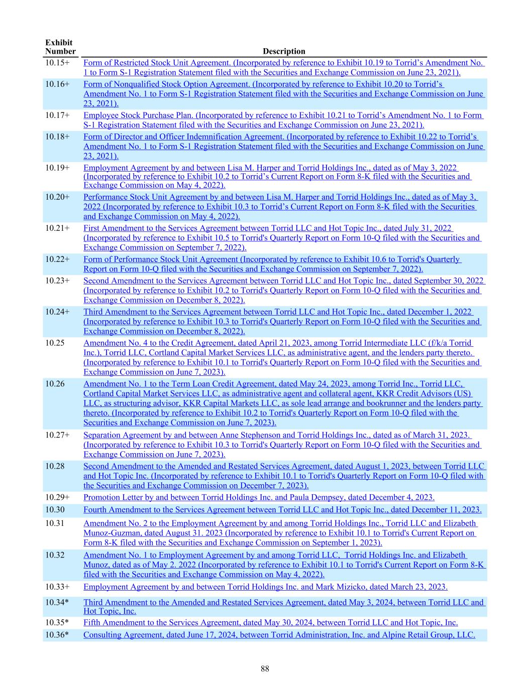 10.15+ Form of Restricted Stock Unit Agreement. (Incorporated by reference to Exhibit 10.19 to Torrid’s Amendment No. 1 to Form S-1 Registration Statement filed with the Securities and Exchange Commission on June 23, 2021). 10.16+ Form of Nonqualified Stock Option Agreement. (Incorporated by reference to Exhibit 10.20 to Torrid’s Amendment No. 1 to Form S-1 Registration Statement filed with the Securities and Exchange Commission on June 23, 2021). 10.17+ Employee Stock Purchase Plan. (Incorporated by reference to Exhibit 10.21 to Torrid’s Amendment No. 1 to Form S-1 Registration Statement filed with the Securities and Exchange Commission on June 23, 2021). 10.18+ Form of Director and Officer Indemnification Agreement. (Incorporated by reference to Exhibit 10.22 to Torrid’s Amendment No. 1 to Form S-1 Registration Statement filed with the Securities and Exchange Commission on June 23, 2021). 10.19+ Employment Agreement by and between Lisa M. Harper and Torrid Holdings Inc., dated as of May 3, 2022 (Incorporated by reference to Exhibit 10.2 to Torrid’s Current Report on Form 8-K filed with the Securities and Exchange Commission on May 4, 2022). 10.20+ Performance Stock Unit Agreement by and between Lisa M. Harper and Torrid Holdings Inc., dated as of May 3, 2022 (Incorporated by reference to Exhibit 10.3 to Torrid’s Current Report on Form 8-K filed with the Securities and Exchange Commission on May 4, 2022). 10.21+ First Amendment to the Services Agreement between Torrid LLC and Hot Topic Inc., dated July 31, 2022 (Incorporated by reference to Exhibit 10.5 to Torrid's Quarterly Report on Form 10-Q filed with the Securities and Exchange Commission on September 7, 2022). 10.22+ Form of Performance Stock Unit Agreement (Incorporated by reference to Exhibit 10.6 to Torrid's Quarterly Report on Form 10-Q filed with the Securities and Exchange Commission on September 7, 2022). 10.23+ Second Amendment to the Services Agreement between Torrid LLC and Hot Topic Inc., dated September 30, 2022 (Incorporated by reference to Exhibit 10.2 to Torrid's Quarterly Report on Form 10-Q filed with the Securities and Exchange Commission on December 8, 2022). 10.24+ Third Amendment to the Services Agreement between Torrid LLC and Hot Topic Inc., dated December 1, 2022 (Incorporated by reference to Exhibit 10.3 to Torrid's Quarterly Report on Form 10-Q filed with the Securities and Exchange Commission on December 8, 2022). 10.25 Amendment No. 4 to the Credit Agreement, dated April 21, 2023, among Torrid Intermediate LLC (f/k/a Torrid Inc.), Torrid LLC, Cortland Capital Market Services LLC, as administrative agent, and the lenders party thereto. (Incorporated by reference to Exhibit 10.1 to Torrid's Quarterly Report on Form 10-Q filed with the Securities and Exchange Commission on June 7, 2023). 10.26 Amendment No. 1 to the Term Loan Credit Agreement, dated May 24, 2023, among Torrid Inc., Torrid LLC, Cortland Capital Market Services LLC, as administrative agent and collateral agent, KKR Credit Advisors (US) LLC, as structuring advisor, KKR Capital Markets LLC, as sole lead arrange and bookrunner and the lenders party thereto. (Incorporated by reference to Exhibit 10.2 to Torrid's Quarterly Report on Form 10-Q filed with the Securities and Exchange Commission on June 7, 2023). 10.27+ Separation Agreement by and between Anne Stephenson and Torrid Holdings Inc., dated as of March 31, 2023. (Incorporated by reference to Exhibit 10.3 to Torrid's Quarterly Report on Form 10-Q filed with the Securities and Exchange Commission on June 7, 2023). 10.28 Second Amendment to the Amended and Restated Services Agreement, dated August 1, 2023, between Torrid LLC and Hot Topic Inc. (Incorporated by reference to Exhibit 10.1 to Torrid's Quarterly Report on Form 10-Q filed with the Securities and Exchange Commission on December 7, 2023). 10.29+ Promotion Letter by and between Torrid Holdings Inc. and Paula Dempsey, dated December 4, 2023. 10.30 Fourth Amendment to the Services Agreement between Torrid LLC and Hot Topic Inc., dated December 11, 2023. 10.31 Amendment No. 2 to the Employment Agreement by and among Torrid Holdings Inc., Torrid LLC and Elizabeth Munoz-Guzman, dated August 31. 2023 (Incorporated by reference to Exhibit 10.1 to Torrid's Current Report on Form 8-K filed with the Securities and Exchange Commission on September 1, 2023). 10.32 Amendment No. 1 to Employment Agreement by and among Torrid LLC, Torrid Holdings Inc. and Elizabeth Munoz, dated as of May 2. 2022 (Incorporated by reference to Exhibit 10.1 to Torrid's Current Report on Form 8-K filed with the Securities and Exchange Commission on May 4, 2022). 10.33+ Employment Agreement by and between Torrid Holdings Inc. and Mark Mizicko, dated March 23, 2023. 10.34* Third Amendment to the Amended and Restated Services Agreement, dated May 3, 2024, between Torrid LLC and Hot Topic, Inc. 10.35* Fifth Amendment to the Services Agreement, dated May 30, 2024, between Torrid LLC and Hot Topic, Inc. 10.36* Consulting Agreement, dated June 17, 2024, between Torrid Administration, Inc. and Alpine Retail Group, LLC. Exhibit Number Description 88