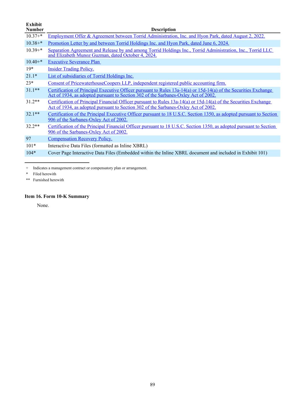 10.37+* Employment Offer & Agreement between Torrid Administration, Inc. and Hyon Park, dated August 2, 2022. 10.38+* Promotion Letter by and between Torrid Holdings Inc. and Hyon Park, dated June 6, 2024. 10.39+* Separation Agreement and Release by and among Torrid Holdings Inc., Torrid Administration, Inc., Torrid LLC and Elizabeth Munoz Guzman, dated October 4, 2024. 10.40+* Executive Severance Plan 19* Insider Trading Policy. 21.1* List of subsidiaries of Torrid Holdings Inc. 23* Consent of PricewaterhouseCoopers LLP, independent registered public accounting firm. 31.1** Certification of Principal Executive Officer pursuant to Rules 13a-14(a) or 15d-14(a) of the Securities Exchange Act of 1934, as adopted pursuant to Section 302 of the Sarbanes-Oxley Act of 2002. 31.2** Certification of Principal Financial Officer pursuant to Rules 13a-14(a) or 15d-14(a) of the Securities Exchange Act of 1934, as adopted pursuant to Section 302 of the Sarbanes-Oxley Act of 2002. 32.1** Certification of the Principal Executive Officer pursuant to 18 U.S.C. Section 1350, as adopted pursuant to Section 906 of the Sarbanes-Oxley Act of 2002. 32.2** Certification of the Principal Financial Officer pursuant to 18 U.S.C. Section 1350, as adopted pursuant to Section 906 of the Sarbanes-Oxley Act of 2002. 97 Compensation Recovery Policy. 101* Interactive Data Files (formatted as Inline XBRL) 104* Cover Page Interactive Data Files (Embedded within the Inline XBRL document and included in Exhibit 101) Exhibit Number Description + Indicates a management contract or compensatory plan or arrangement. * Filed herewith ** Furnished herewith Item 16. Form 10-K Summary None. 89