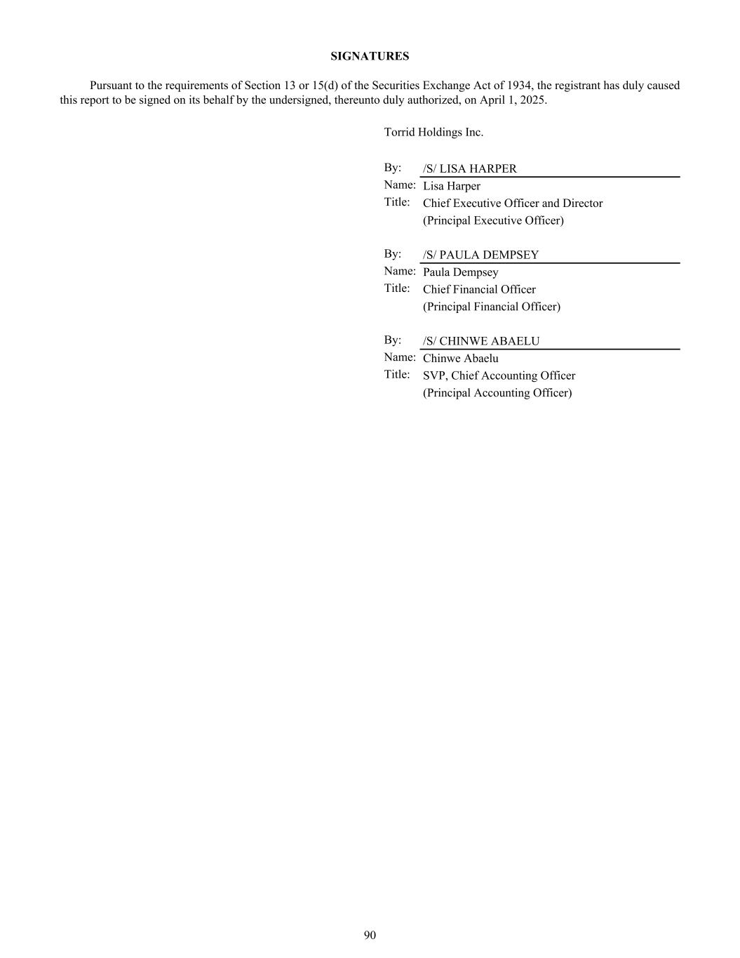 SIGNATURES Pursuant to the requirements of Section 13 or 15(d) of the Securities Exchange Act of 1934, the registrant has duly caused this report to be signed on its behalf by the undersigned, thereunto duly authorized, on April 1, 2025. Torrid Holdings Inc. By: /S/ LISA HARPER Name: Lisa Harper Title: Chief Executive Officer and Director (Principal Executive Officer) By: /S/ PAULA DEMPSEY Name: Paula Dempsey Title: Chief Financial Officer (Principal Financial Officer) By: /S/ CHINWE ABAELU Name: Chinwe Abaelu Title: SVP, Chief Accounting Officer (Principal Accounting Officer) 90
