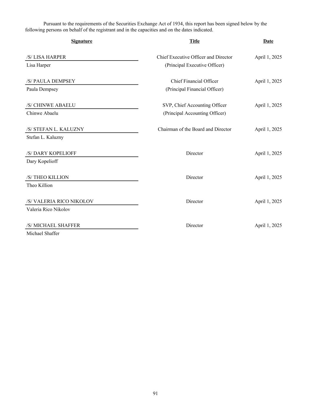 Pursuant to the requirements of the Securities Exchange Act of 1934, this report has been signed below by the following persons on behalf of the registrant and in the capacities and on the dates indicated. Signature Title Date /S/ LISA HARPER Chief Executive Officer and Director April 1, 2025 Lisa Harper (Principal Executive Officer) /S/ PAULA DEMPSEY Chief Financial Officer April 1, 2025 Paula Dempsey (Principal Financial Officer) /S/ CHINWE ABAELU SVP, Chief Accounting Officer April 1, 2025 Chinwe Abaelu (Principal Accounting Officer) /S/ STEFAN L. KALUZNY Chairman of the Board and Director April 1, 2025 Stefan L. Kaluzny /S/ DARY KOPELIOFF Director April 1, 2025 Dary Kopelioff /S/ THEO KILLION Director April 1, 2025 Theo Killion /S/ VALERIA RICO NIKOLOV Director April 1, 2025 Valeria Rico Nikolov /S/ MICHAEL SHAFFER Director April 1, 2025 Michael Shaffer 91
