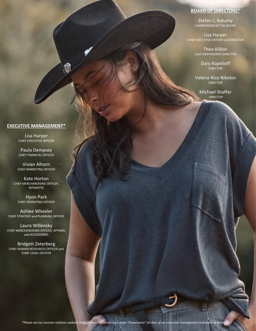 EXECUTIVE MANAGEMENT* Lisa Harper CHIEF EXECUTIVE OFFICER Paula Dempsey CHIEF FINANCIAL OFFICER Vivian Alhorn CHIEF MARKETING OFFICER Kate Horton CHIEF MERCHANDISING OFFICER, INTIMATES Hyon Park CHIEF OPERATING OFFICER Ashlee Wheeler CHIEF STRATEGY and PLANNING OFFICER Laura Willensky CHIEF MERCHANDISING OFFICER, APPAREL and ACCESSORIES Bridgett Zeterberg CHIEF HUMAN RESOURCES OFFICER and CHIEF LEGAL OFFICER BOARD OF DIRECTORS* Stefan L. Kaluzny CHAIRPERSON OF THE BOARD Lisa Harper CHIEF EXECUTIVE OFFICER and DIRECTOR Theo Killion LEAD INDEPENDENT DIRECTOR Dary Kopelioff DIRECTOR Valeria Rico Nikolov DIRECTOR Michael Shaffer DIRECTOR *Please see our investor relations website (https://investors.torrid.com) under “Governance” for bios of our executive management and board of directors.