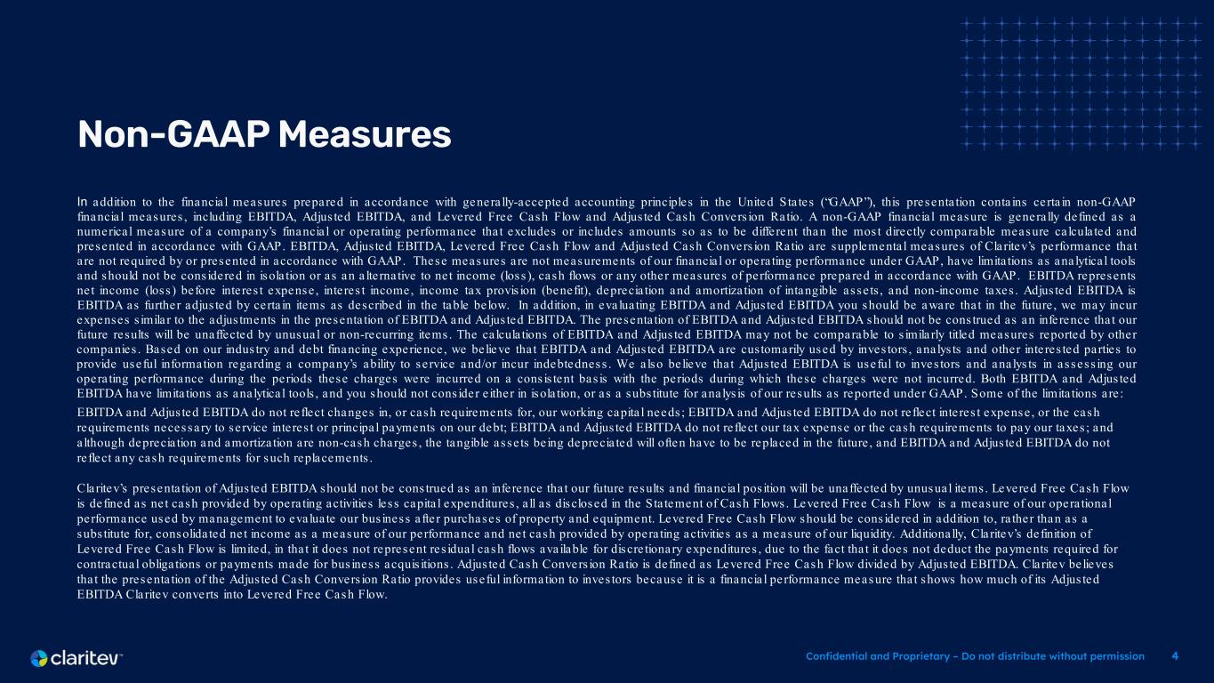 Confidential and Proprietary – Do not distribute without permission 4 Non-GAAP Measures In addition to the financia l measures prepared in accordance with genera lly-accepted accounting principles in the United Sta tes (“GAAP”), this presenta tion conta ins certa in non-GAAP financia l measures , including EBITDA, Adjus ted EBITDA, and Levered Free Cash Flow and Adjus ted Cash Convers ion Ratio. A non-GAAP financia l measure is genera lly defined as a numerica l measure of a company’s financia l or operating performance tha t excludes or includes amounts so as to be diffe rent than the mos t directly comparable measure ca lcula ted and presented in accordance with GAAP. EBITDA, Adjus ted EBITDA, Levered Free Cash Flow and Adjus ted Cash Convers ion Ratio a re supplementa l measures of Claritev’s performance tha t a re not required by or presented in accordance with GAAP. These measures a re not measurements of our financia l or opera ting performance under GAAP, have limita tions as ana lytica l tools and should not be cons idered in isola tion or as an a lte rna tive to ne t income (loss ), cash flows or any other measures of performance prepared in accordance with GAAP. EBITDA represents ne t income (loss ) before inte res t expense , inte res t income, income tax provis ion (benefit), deprecia tion and amortiza tion of intangible as se ts , and non-income taxes . Adjus ted EBITDA is EBITDA as further adjus ted by certa in items as described in the table be low. In addition, in eva lua ting EBITDA and Adjus ted EBITDA you should be aware tha t in the future , we may incur expenses s imila r to the adjus tments in the presenta tion of EBITDA and Adjus ted EBITDA. The presenta tion of EBITDA and Adjus ted EBITDA should not be cons trued as an inference tha t our future results will be unaffected by unusua l or non-recurring items . The ca lcula tions of EBITDA and Adjus ted EBITDA may not be comparable to s imila rly titled measures reported by other companies . Based on our indus try and debt financing experience , we be lieve tha t EBITDA and Adjus ted EBITDA are cus tomarily used by inves tors , ana lys ts and other inte res ted parties to provide useful information regarding a company’s ability to se rvice and/or incur indebtedness . We a lso be lieve tha t Adjus ted EBITDA is useful to inves tors and ana lys ts in as sess ing our opera ting performance during the periods these charges were incurred on a cons is tent bas is with the periods during which these charges were not incurred. Both EBITDA and Adjus ted EBITDA have limita tions as ana lytica l tools , and you should not cons ider e ither in isola tion, or as a subs titute for ana lys is of our results as reported under GAAP. Some of the limita tions a re : EBITDA and Adjus ted EBITDA do not re flect changes in, or cash requirements for, our working capita l needs ; EBITDA and Adjus ted EBITDA do not re flect inte res t expense , or the cash requirements necessary to se rvice inte res t or principa l payments on our debt; EBITDA and Adjus ted EBITDA do not re flect our tax expense or the cash requirements to pay our taxes ; and a lthough deprecia tion and amortiza tion a re non-cash charges , the tangible as se ts be ing deprecia ted will often have to be replaced in the future , and EBITDA and Adjus ted EBITDA do not re flect any cash requirements for such replacements . Claritev’s presenta tion of Adjus ted EBITDA should not be cons trued as an inference tha t our future results and financia l pos ition will be unaffected by unusua l items . Levered Free Cash Flow is defined as ne t cash provided by opera ting activities les s capita l expenditures , a ll as disclosed in the Sta tement of Cash Flows . Levered Free Cash Flow is a measure of our opera tiona l performance used by management to eva lua te our bus iness a fte r purchases of property and equipment. Levered Free Cash Flow should be cons idered in addition to, ra ther than as a subs titute for, consolida ted ne t income as a measure of our performance and ne t cash provided by opera ting activities as a measure of our liquidity. Additiona lly, Claritev’s definition of Levered Free Cash Flow is limited, in tha t it does not represent res idua l cash flows ava ilable for discre tionary expenditures , due to the fact tha t it does not deduct the payments required for contractua l obliga tions or payments made for bus iness acquis itions . Adjus ted Cash Convers ion Ratio is defined as Levered Free Cash Flow divided by Adjus ted EBITDA. Claritev be lieves tha t the presenta tion of the Adjus ted Cash Convers ion Ratio provides useful information to inves tors because it is a financia l performance measure tha t shows how much of its Adjus ted EBITDA Claritev converts into Levered Free Cash Flow.