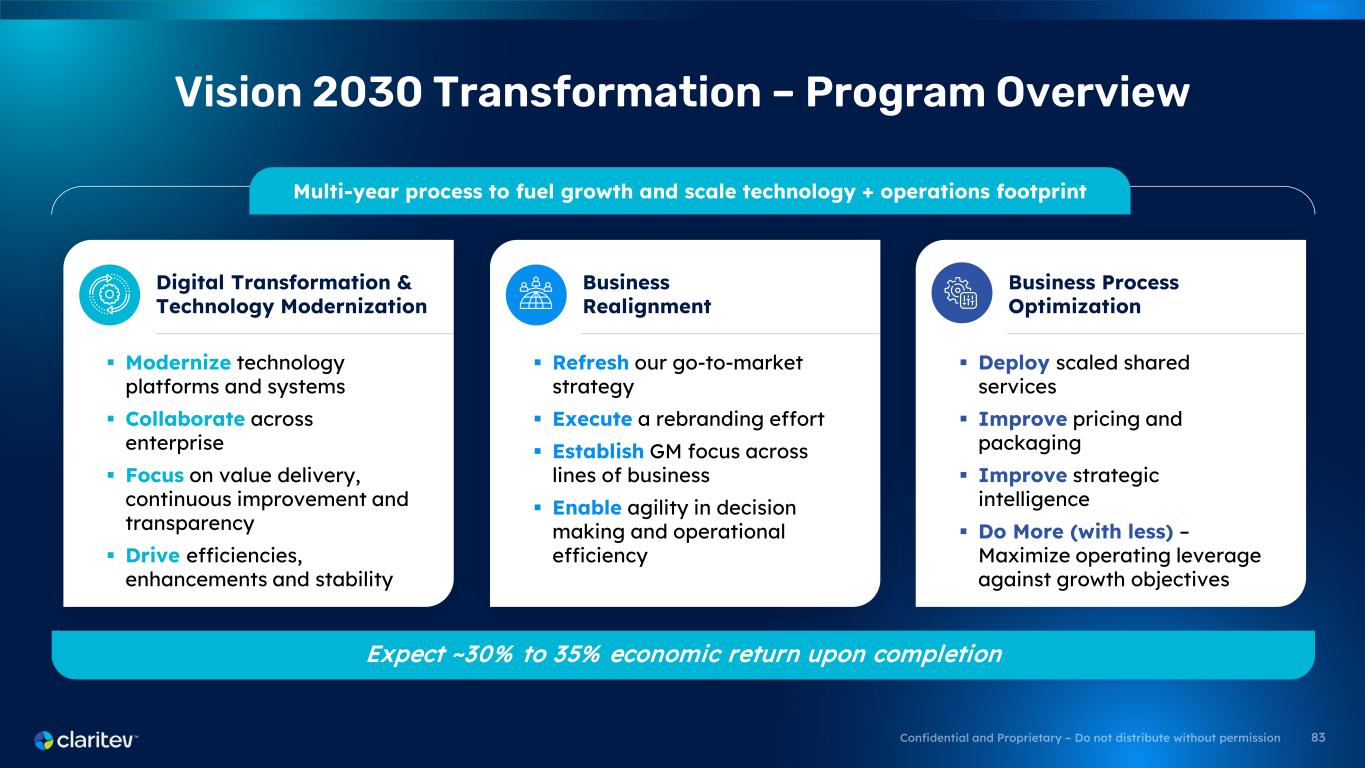 Confidential and Proprietary – Do not distribute without permission 83 Vision 2030 Transformation – Program Overview Digital Transformation & Technology Modernization Business Realignment Business Process Optimization Modernize technology platforms and systems Collaborate across enterprise Focus on value delivery, continuous improvement and transparency Drive efficiencies, enhancements and stability Refresh our go-to-market strategy Execute a rebranding effort Establish GM focus across lines of business Enable agility in decision making and operational efficiency Deploy scaled shared services Improve pricing and packaging Improve strategic intelligence Do More (with less) – Maximize operating leverage against growth objectives Multi-year process to fuel growth and scale technology + operations footprint Expect ~30% to 35% economic return upon completion