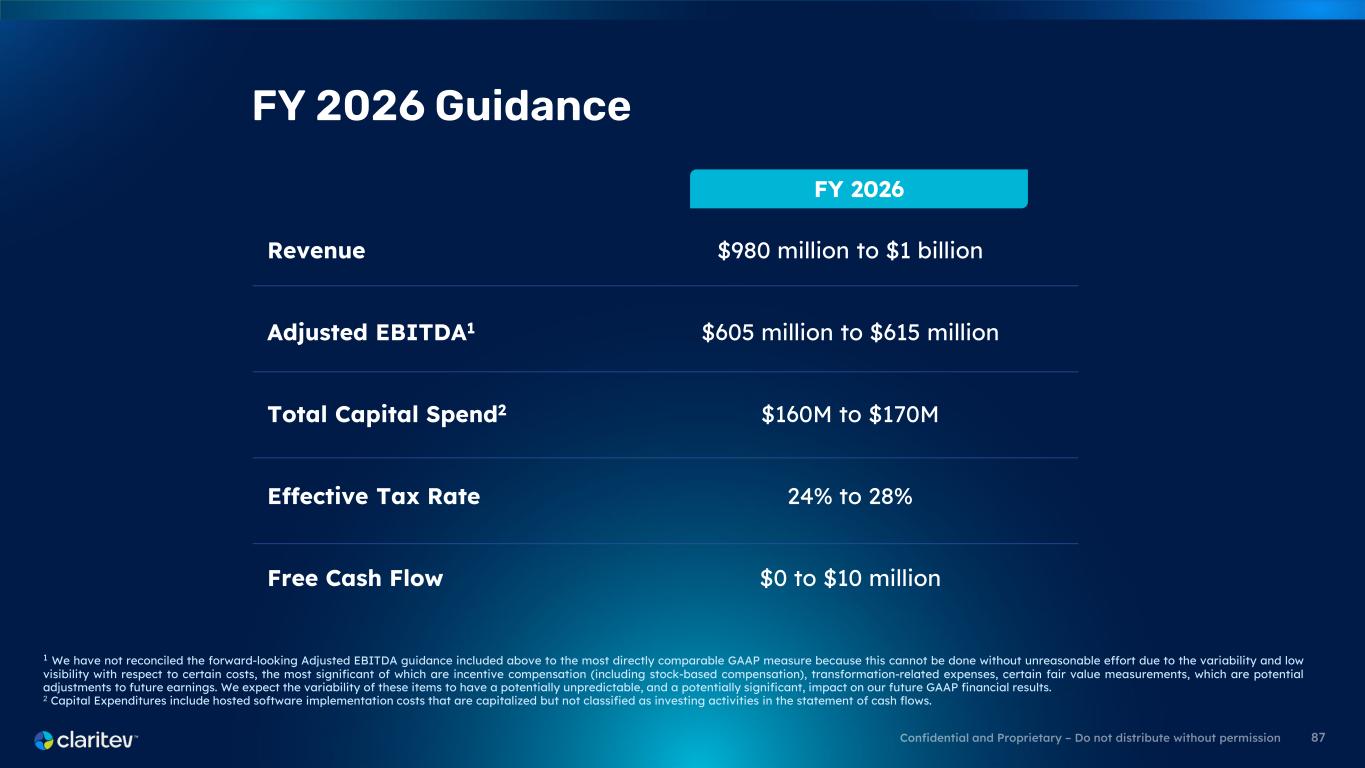 Confidential and Proprietary – Do not distribute without permission 87 FY 2026 Guidance 1 We have not reconciled the forward-looking Adjusted EBITDA guidance included above to the most directly comparable GAAP measure because this cannot be done without unreasonable effort due to the variability and low visibility with respect to certain costs, the most significant of which are incentive compensation (including stock-based compensation), transformation-related expenses, certain fair value measurements, which are potential adjustments to future earnings. We expect the variability of these items to have a potentially unpredictable, and a potentially significant, impact on our future GAAP financial results. 2 Capital Expenditures include hosted software implementation costs that are capitalized but not classified as investing activities in the statement of cash flows. Revenue Adjusted EBITDA1 Total Capital Spend2 Effective Tax Rate Free Cash Flow $980 million to $1 billion $605 million to $615 million $160M to $170M 24% to 28% $0 to $10 million FY 2026