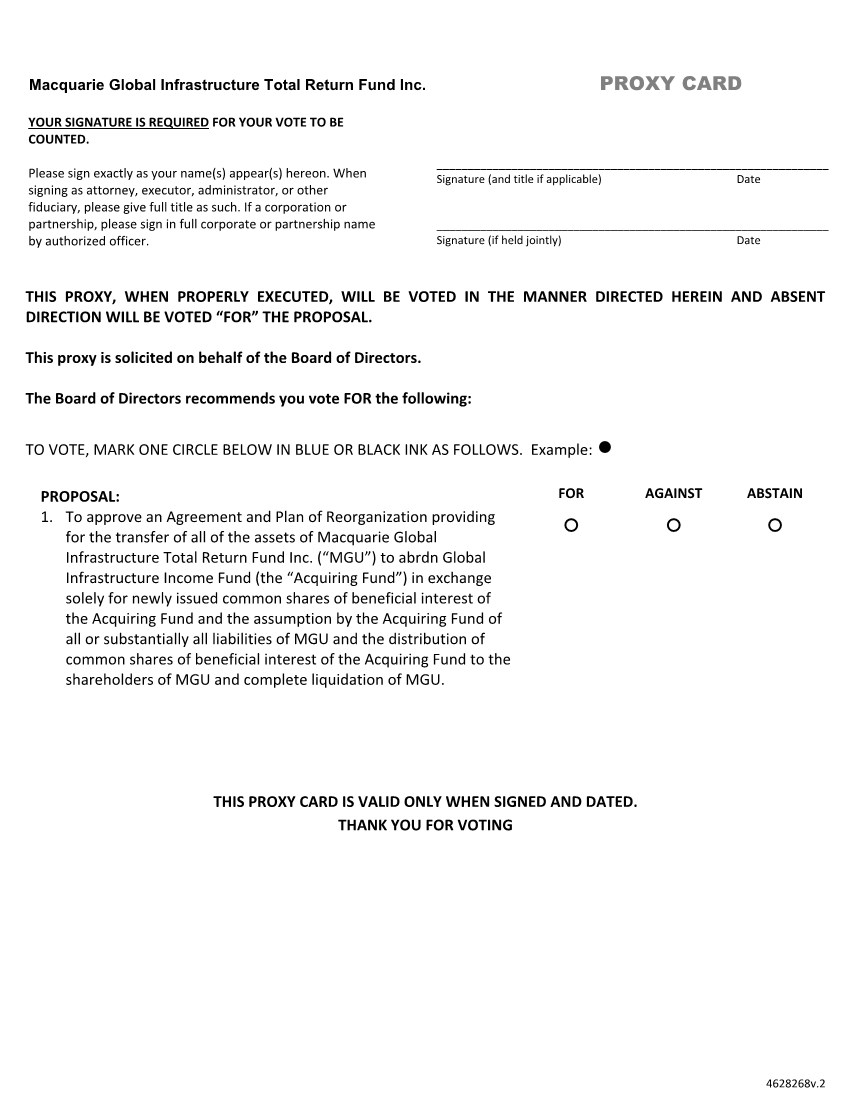 We are pleased to enclose a notice, combined proxy statement/prospectus (the “Proxy Statement/Prospectus”), and proxy card(s) for a special meeting of shareholders (the “Special Meeting”) relating to Macquarie Global Infrastructure Total Return Fund Inc., a Maryland corporation (the “Acquired Fund”). The Special Meeting is scheduled to be held online via live webcast on November 9, 2022, at 3:00pm ET, to vote on the approval of a proposed Agreement and Plan of Reorganization for the Acquired Fund, which contemplates the reorganization of the Acquired Fund into abrdn Global Infrastructure Income Fund (the “Acquiring Fund”), a Maryland statutory trust, (the “Reorganization”). The Acquiring Fund as it would exist after the Reorganization is referred to as the “Combined Fund.”