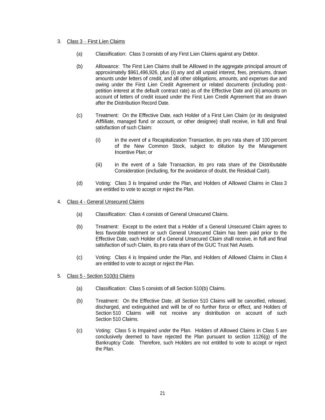21 3. Class 3 – First Lien Claims (a) Classification: Class 3 consists of any First Lien Claims against any Debtor. (b) Allowance: The First Lien Claims shall be Allowed in the aggregate principal amount of approximately $961,496,926, plus (i) any and all unpaid interest, fees, premiums, drawn amounts under letters of credit, and all other obligations, amounts, and expenses due and owing under the First Lien Credit Agreement or related documents (including post- petition interest at the default contract rate) as of the Effective Date and (ii) amounts on account of letters of credit issued under the First Lien Credit Agreement that are drawn after the Distribution Record Date. (c) Treatment: On the Effective Date, each Holder of a First Lien Claim (or its designated Affiliate, managed fund or account, or other designee) shall receive, in full and final satisfaction of such Claim: (i) in the event of a Recapitalization Transaction, its pro rata share of 100 percent of the New Common Stock, subject to dilution by the Management Incentive Plan; or (ii) in the event of a Sale Transaction, its pro rata share of the Distributable Consideration (including, for the avoidance of doubt, the Residual Cash). (d) Voting: Class 3 is Impaired under the Plan, and Holders of Allowed Claims in Class 3 are entitled to vote to accept or reject the Plan. 4. Class 4 - General Unsecured Claims (a) Classification: Class 4 consists of General Unsecured Claims. (b) Treatment: Except to the extent that a Holder of a General Unsecured Claim agrees to less favorable treatment or such General Unsecured Claim has been paid prior to the Effective Date, each Holder of a General Unsecured Claim shall receive, in full and final satisfaction of such Claim, its pro rata share of the GUC Trust Net Assets. (c) Voting: Class 4 is Impaired under the Plan, and Holders of Allowed Claims in Class 4 are entitled to vote to accept or reject the Plan. 5. Class 5 - Section 510(b) Claims (a) Classification: Class 5 consists of all Section 510(b) Claims. (b) Treatment: On the Effective Date, all Section 510 Claims will be cancelled, released, discharged, and extinguished and will be of no further force or effect, and Holders of Section 510 Claims will not receive any distribution on account of such Section 510 Claims. (c) Voting: Class 5 is Impaired under the Plan. Holders of Allowed Claims in Class 5 are conclusively deemed to have rejected the Plan pursuant to section 1126(g) of the Bankruptcy Code. Therefore, such Holders are not entitled to vote to accept or reject the Plan.