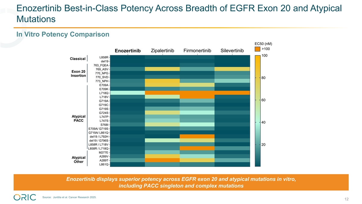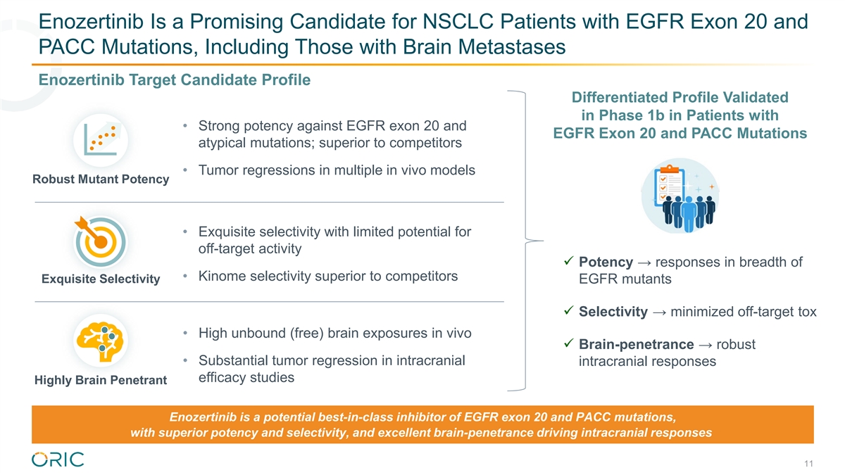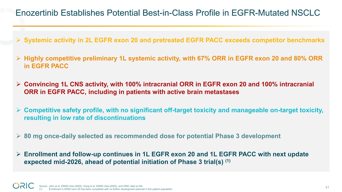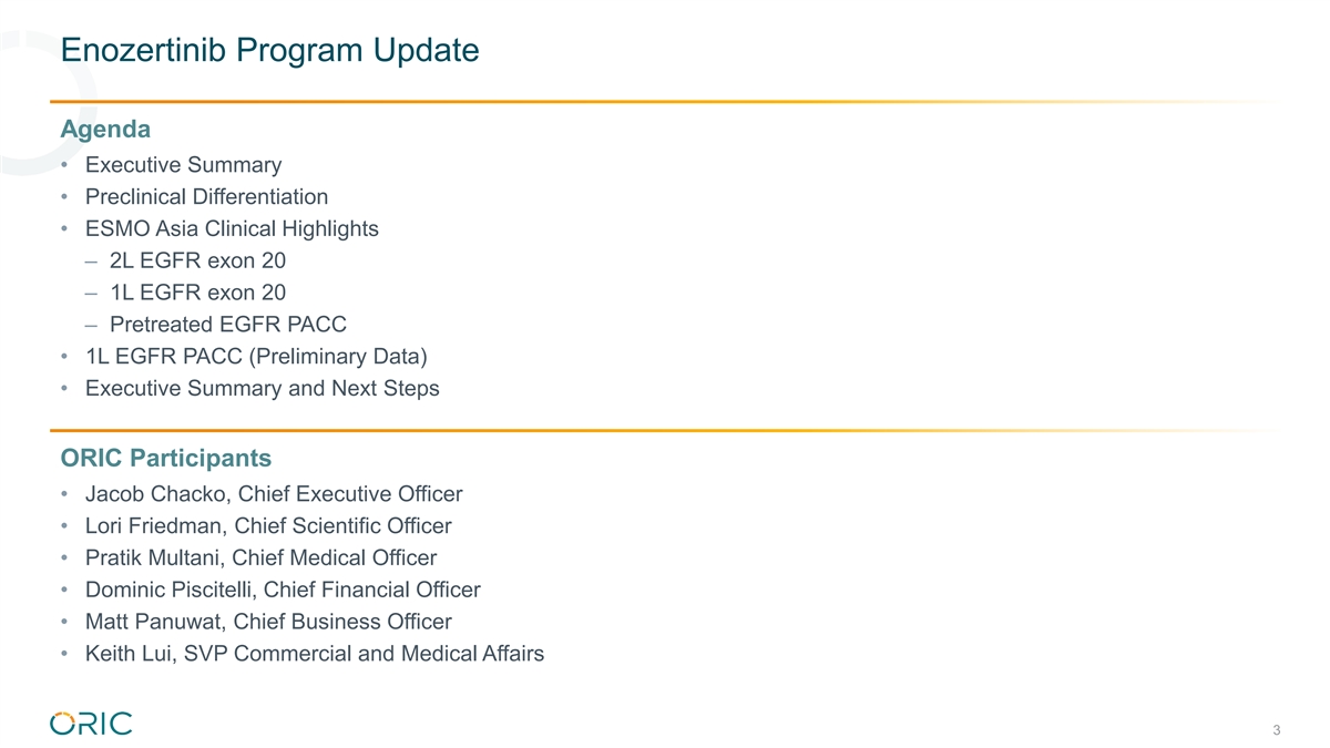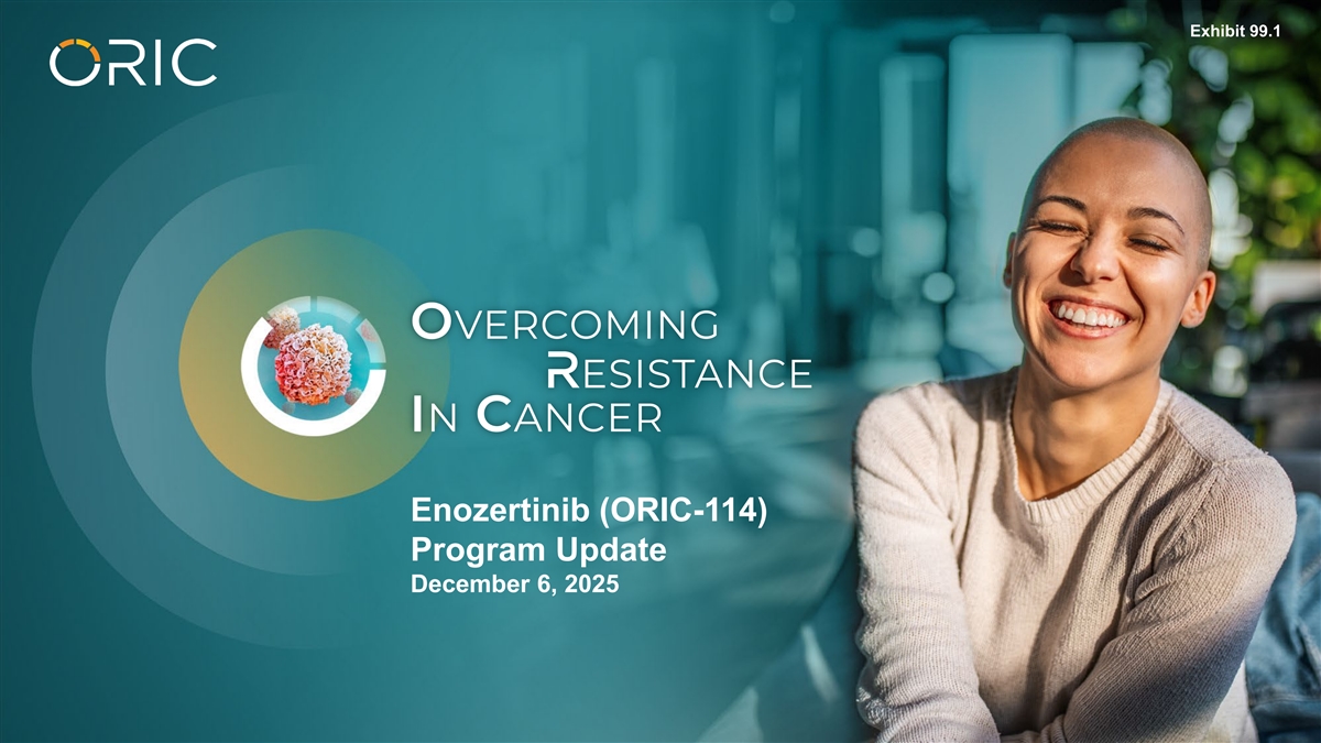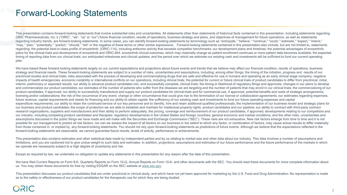 Forward-Looking Statements This presentation contains forward-looking statements that involve substantial risks and uncertainties. All statements other than statements of historical facts contained in this presentation, including statements regarding ORIC Pharmaceuticals, Inc.’s (“ORIC”, “we”, “us” or “our”) future financial condition, results of operations, business strategy and plans, and objectives of management for future operations, as well as statements regarding industry trends, are forward-looking statements. In some cases, you can identify forward-looking statements by terminology such as “anticipate,” “believe,” “continue,” “could,” “estimate,” “expect,” “intend,” “may,” “plan,” “potentially,” “predict,” “should,” “will” or the negative of these terms or other similar expressions. Forward-looking statements contained in this presentation also include, but are not limited to, statements regarding: the potential best-in-class profile of enozertinib (ORIC-114), including antitumor activity that exceeds competitor benchmarks; our development plans and timelines; the potential advantages of enozertinib; plans for the clinical trials and development of enozertinib and ORIC-944; enozertinib clinical outcomes, which may materially change as patient enrollment continues or more patient data becomes available; the expected timing of reporting data from our clinical trials; our anticipated milestones and clinical updates; and the period over which we estimate our existing cash and investments will be sufficient to fund our current operating plan. We have based these forward-looking statements largely on our current expectations and projections about future events and trends that we believe may affect our financial condition, results of operations, business strategy and financial needs. These forward-looking statements are subject to a number of risks, uncertainties and assumptions, including, among other things: the timing of the initiation, progress and results of our preclinical studies and clinical trials; risks associated with the process of developing and commercializing drugs that are safe and effective for use in humans and operating as an early clinical stage company; negative impacts of health emergencies, economic instability or international conflicts on our operations, including clinical trials; the potential for current or future clinical trials of product candidates to differ from preclinical, initial, interim, preliminary or expected results; our ability to advance product candidates into, and successfully complete, clinical trials; the timing or likelihood of regulatory filings and approvals; changes in our plans to develop and commercialize our product candidates; our estimates of the number of patients who suffer from the diseases we are targeting and the number of patients that may enroll in our clinical trials; the commercializing of our product candidates, if approved; our ability to successfully manufacture and supply our product candidates for clinical trials and for commercial use, if approved; potential benefits and costs of strategic arrangements, licensing and/or collaborations; the risk of the occurrence of any event, change or other circumstance that could give rise to the termination of our license or collaboration agreements; our estimates regarding expenses, future revenue, capital requirements and needs for financing and our ability to obtain capital; the sufficiency of our existing cash and investments to fund our future operating expenses and capital expenditure requirements; our ability to retain the continued service of our key personnel and to identify, hire and retain additional qualified professionals; the implementation of our business model and strategic plans for our business and product candidates; the scope of protection we are able to establish and maintain for intellectual property rights, product candidates and our pipeline; our ability to contract with third-party contract research organizations, suppliers and manufacturers and their ability to perform adequately; the pricing, coverage and reimbursement of our product candidates, if approved; developments relating to our competitors and our industry, including competing product candidates and therapies; regulatory developments in the United States and foreign countries; general economic and market conditions; and the other risks, uncertainties and assumptions discussed in the public filings we have made and will make with the Securities and Exchange Commission (“SEC”). These risks are not exhaustive. New risk factors emerge from time to time and it is not possible for our management to predict all risk factors, nor can we assess the impact of all factors on our business or the extent to which any factor, or combination of factors, may cause actual results to differ materially from those contained in, or implied by, any forward-looking statements. You should not rely upon forward-looking statements as predictions of future events. Although we believe that the expectations reflected in the forward-looking statements are reasonable, we cannot guarantee future results, levels of activity, performance or achievements. This presentation also contains estimates and other statistical data made by independent parties and by us relating to market size and other data about our industry. This data involves a number of assumptions and limitations, and you are cautioned not to give undue weight to such data and estimates. In addition, projections, assumptions and estimates of our future performance and the future performance of the markets in which we operate are necessarily subject to a high degree of uncertainty and risk. Except as required by law, we undertake no obligation to update any statements in this presentation for any reason after the date of this presentation. We have filed Current Reports on Form 8-K, Quarterly Report