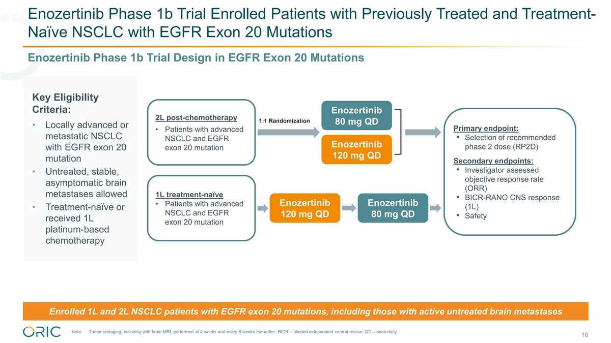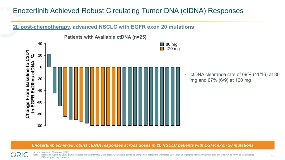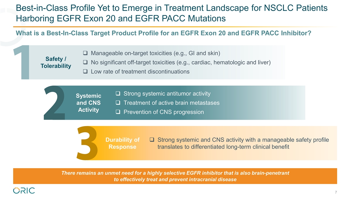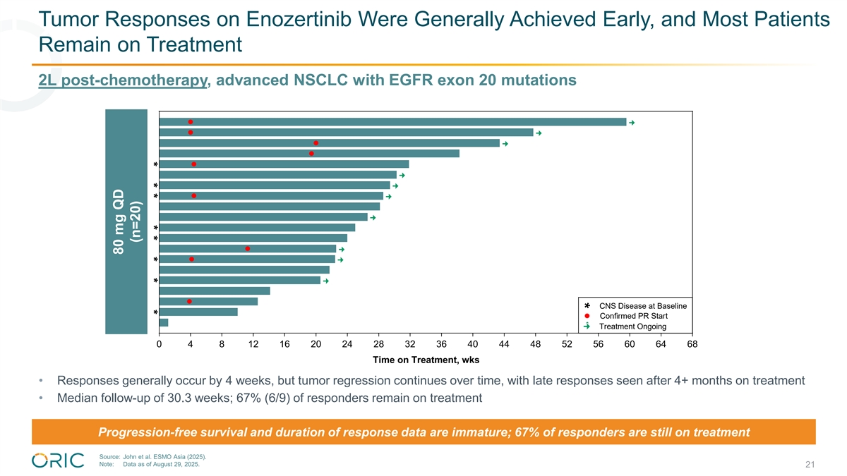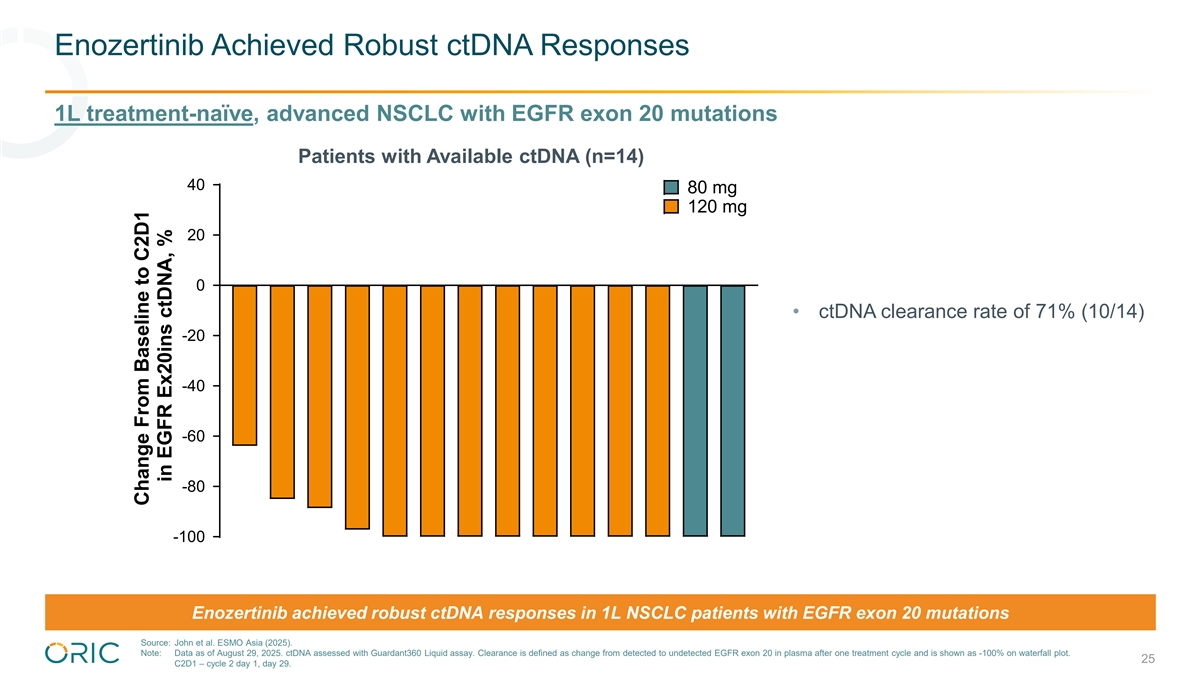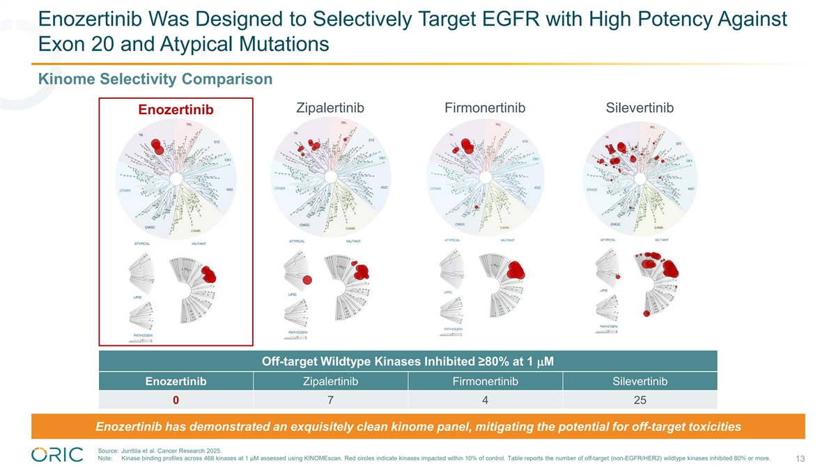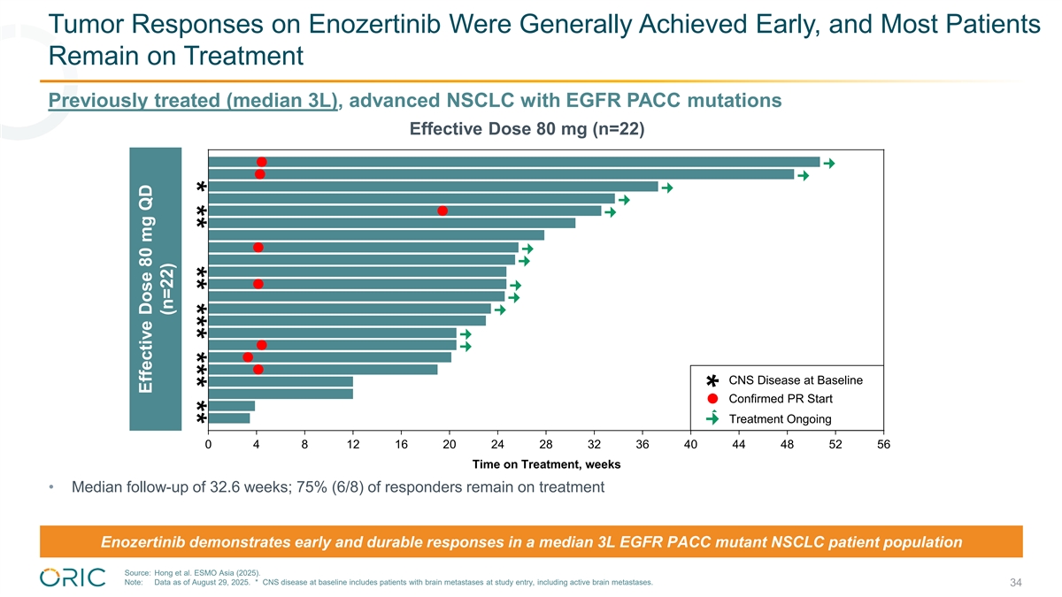 Forward-Looking Statements This presentation contains forward-looking statements that involve substantial risks and uncertainties. All statements other than statements of historical facts contained in this presentation, including statements regarding ORIC Pharmaceuticals, Inc.’s (“ORIC”, “we”, “us” or “our”) future financial condition, results of operations, business strategy and plans, and objectives of management for future operations, as well as statements regarding industry trends, are forward-looking statements. In some cases, you can identify forward-looking statements by terminology such as “anticipate,” “believe,” “continue,” “could,” “estimate,” “expect,” “intend,” “may,” “plan,” “potentially,” “predict,” “should,” “will” or the negative of these terms or other similar expressions. Forward-looking statements contained in this presentation also include, but are not limited to, statements regarding: the potential best-in-class profile of enozertinib (ORIC-114), including antitumor activity that exceeds competitor benchmarks; our development plans and timelines; the potential advantages of enozertinib; plans for the clinical trials and development of enozertinib and ORIC-944; enozertinib clinical outcomes, which may materially change as patient enrollment continues or more patient data becomes available; the expected timing of reporting data from our clinical trials; our anticipated milestones and clinical updates; and the period over which we estimate our existing cash and investments will be sufficient to fund our current operating plan. We have based these forward-looking statements largely on our current expectations and projections about future events and trends that we believe may affect our financial condition, results of operations, business strategy and financial needs. These forward-looking statements are subject to a number of risks, uncertainties and assumptions, including, among other things: the timing of the initiation, progress and results of our preclinical studies and clinical trials; risks associated with the process of developing and commercializing drugs that are safe and effective for use in humans and operating as an early clinical stage company; negative impacts of health emergencies, economic instability or international conflicts on our operations, including clinical trials; the potential for current or future clinical trials of product candidates to differ from preclinical, initial, interim, preliminary or expected results; our ability to advance product candidates into, and successfully complete, clinical trials; the timing or likelihood of regulatory filings and approvals; changes in our plans to develop and commercialize our product candidates; our estimates of the number of patients who suffer from the diseases we are targeting and the number of patients that may enroll in our clinical trials; the commercializing of our product candidates, if approved; our ability to successfully manufacture and supply our product candidates for clinical trials and for commercial use, if approved; potential benefits and costs of strategic arrangements, licensing and/or collaborations; the risk of the occurrence of any event, change or other circumstance that could give rise to the termination of our license or collaboration agreements; our estimates regarding expenses, future revenue, capital requirements and needs for financing and our ability to obtain capital; the sufficiency of our existing cash and investments to fund our future operating expenses and capital expenditure requirements; our ability to retain the continued service of our key personnel and to identify, hire and retain additional qualified professionals; the implementation of our business model and strategic plans for our business and product candidates; the scope of protection we are able to establish and maintain for intellectual property rights, product candidates and our pipeline; our ability to contract with third-party contract research organizations, suppliers and manufacturers and their ability to perform adequately; the pricing, coverage and reimbursement of our product candidates, if approved; developments relating to our competitors and our industry, including competing product candidates and therapies; regulatory developments in the United States and foreign countries; general economic and market conditions; and the other risks, uncertainties and assumptions discussed in the public filings we have made and will make with the Securities and Exchange Commission (“SEC”). These risks are not exhaustive. New risk factors emerge from time to time and it is not possible for our management to predict all risk factors, nor can we assess the impact of all factors on our business or the extent to which any factor, or combination of factors, may cause actual results to differ materially from those contained in, or implied by, any forward-looking statements. You should not rely upon forward-looking statements as predictions of future events. Although we believe that the expectations reflected in the forward-looking statements are reasonable, we cannot guarantee future results, levels of activity, performance or achievements. This presentation also contains estimates and other statistical data made by independent parties and by us relating to market size and other data about our industry. This data involves a number of assumptions and limitations, and you are cautioned not to give undue weight to such data and estimates. In addition, projections, assumptions and estimates of our future performance and the future performance of the markets in which we operate are necessarily subject to a high degree of uncertainty and risk. Except as required by law, we undertake no obligation to update any statements in this presentation for any reason after the date of this presentation. We have filed Current Reports on Form 8-K, Quarterly Report