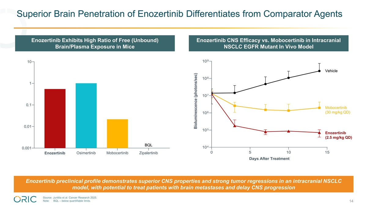 Enozertinib Was Designed to Selectively Target EGFR with High Potency Against Exon 20 and Atypical Mutations Kinome Selectivity Comparison Zipalertinib Firmonertinib Silevertinib Enozertinib Off-target Wildtype Kinases Inhibited ≥80% at 1µM Enozertinib Zipalertinib Firmonertinib Silevertinib 0 7 4 25 Enozertinib has demonstrated an exquisitely clean kinome panel, mitigating the potential for off-target toxicities Source: Junttila et al. Cancer Research 2025. Note: Kinase binding profiles across 468 kinases at 1 μM assessed using KINOMEscan. Red circles indicate kinases impacted within 10% of control. Table reports the number of off-target (non-EGFR/HER2) wildtype kinases inhibited 80% or more. 13