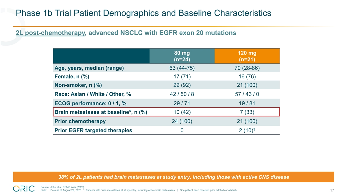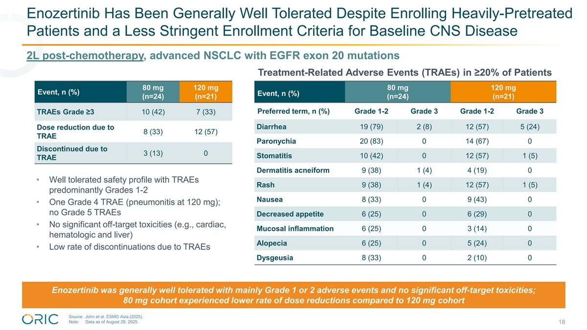Phase 1b Trial Patient Demographics and Baseline Characteristics 2L post-chemotherapy, advanced NSCLC with EGFR exon 20 mutations 80 mg 120 mg (n=24) (n=21) Age, years, median (range) 63 (44-75) 70 (28-86) Female, n (%) 17 (71) 16 (76) Non-smoker, n (%) 22 (92) 21 (100) Race: Asian / White / Other, % 42 / 50 / 8 57 / 43 / 0 ECOG performance: 0 / 1, % 29 / 71 19 / 81 Brain metastases at baseline*, n (%) 10 (42) 7 (33) Prior chemotherapy 24 (100) 21 (100) † Prior EGFR targeted therapies 0 2 (10) 38% of 2L patients had brain metastases at study entry, including those with active CNS disease Source: John et al. ESMO Asia (2025). Note: Data as of August 29, 2025. * Patients with brain metastases at study entry, including active brain metastases. † One patient each received prior erlotinib or afatinib. 17