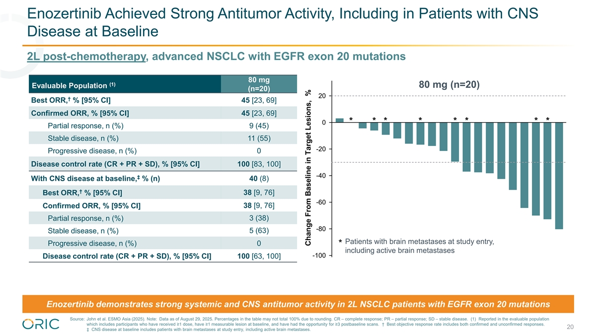 Enozertinib Achieved Robust Circulating Tumor DNA (ctDNA) Responses 2L post-chemotherapy, advanced NSCLC with EGFR exon 20 mutations Patients with Available ctDNA (n=25) 40 80 mg 120 mg 20 0 • ctDNA clearance rate of 69% (11/16) at 80 -20 mg and 67% (6/9) at 120 mg -40 -60 -80 -100 Enozertinib achieved robust ctDNA responses across doses in 2L NSCLC patients with EGFR exon 20 mutations Source: John et al. ESMO Asia (2025). Note: Data as of August 29, 2025. ctDNA assessed with Guardant360 Liquid assay. Clearance is defined as change from detected to undetected EGFR exon 20 in plasma after one treatment cycle and is shown as -100% on waterfall plot. 19 C2D1 – cycle 2 day 1, day 29. Change From Baseline to C2D1 in EGFR Ex20ins ctDNA, %