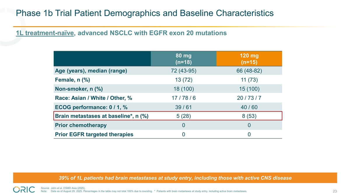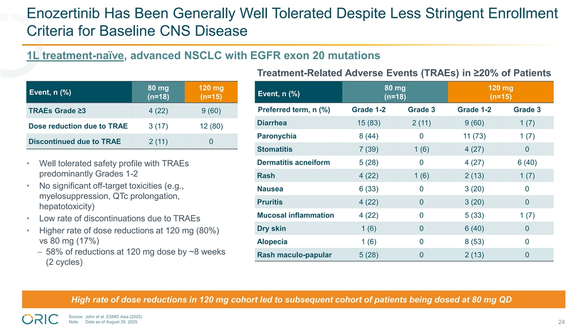 Phase 1b Trial Patient Demographics and Baseline Characteristics 1L treatment-naïve, advanced NSCLC with EGFR exon 20 mutations 80 mg 120 mg (n=18) (n=15) Age (years), median (range) 72 (43-95) 66 (48-82) Female, n (%) 13 (72) 11 (73) Non-smoker, n (%) 18 (100) 15 (100) Race: Asian / White / Other, % 17 / 78 / 6 20 / 73 / 7 ECOG performance: 0 / 1, % 39 / 61 40 / 60 Brain metastases at baseline*, n (%) 5 (28) 8 (53) Prior chemotherapy 0 0 Prior EGFR targeted therapies 0 0 39% of 1L patients had brain metastases at study entry, including those with active CNS disease Source: John et al. ESMO Asia (2025). Note: Data as of August 29, 2025. Percentages in the table may not total 100% due to rounding. * Patients with brain metastases at study entry, including active brain metastases. 23