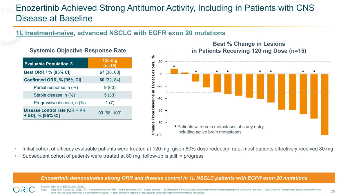 Enozertinib Achieved Robust ctDNA Responses 1L treatment-naïve, advanced NSCLC with EGFR exon 20 mutations Patients with Available ctDNA (n=14) 40 80 mg 120 mg 20 0 • ctDNA clearance rate of 71% (10/14) -20 -40 -60 -80 -100 Enozertinib achieved robust ctDNA responses in 1L NSCLC patients with EGFR exon 20 mutations Source: John et al. ESMO Asia (2025). Note: Data as of August 29, 2025. ctDNA assessed with Guardant360 Liquid assay. Clearance is defined as change from detected to undetected EGFR exon 20 in plasma after one treatment cycle and is shown as -100% on waterfall plot. 25 C2D1 – cycle 2 day 1, day 29. Change From Baseline to C2D1 in EGFR Ex20ins ctDNA, %