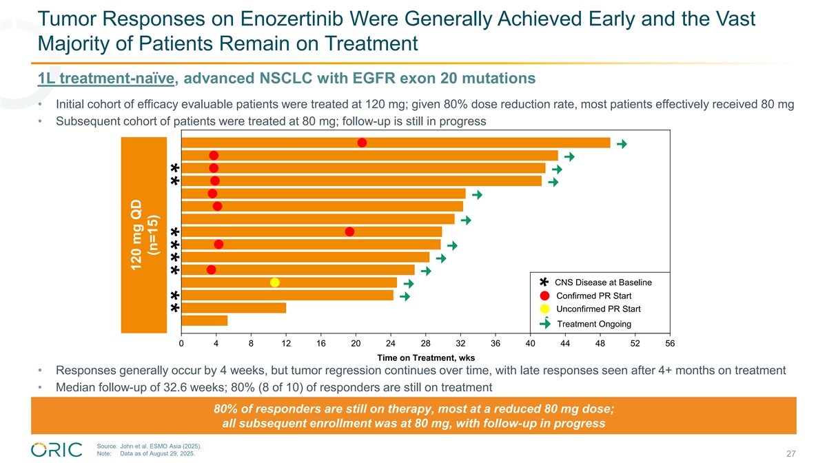 Enozertinib Phase 1b Data Establishes Potential Best-in-Class Profile in EGFR Exon 20 and PACC Mutated NSCLC Enozertinib Updated Phase 1b Data Highlights 2L EGFR Exon 20 Median 3L EGFR PACC 45% 36% ORR ORR Enozertinib Enozertinib Previously Treated 22% 40% Benchmark ORR Benchmark ORR 1L EGFR Exon 20 (Preliminary Data) 1L EGFR PACC (Preliminary Data) 80% ORR 67% ORR Enozertinib Enozertinib Treatment- Naïve (1L) Intracranial ORR Enozertinib 100% Intracranial ORR Enozertinib 100% Enozertinib data in previously treated patients with EGFR exon 20 and PACC mutations exceed competitor benchmarks; preliminary 1L systemic and intracranial activity establishes potential best-in-class profile Source: John et al. ESMO Asia (2025), Hong et al. ESMO Asia (2025), and ORIC data on file. Benchmark ORR: Piotrowska et al. J Clin Oncol (2025) and Udagawa et al. WCLC (2025). Note: All data in previously treated patients represent confirmed ORR. All data in 1L patients represent best ORR, due to preliminary nature of data. 1L EGFR exon 20 intracranial ORR data in all patients with measurable CNS disease by BICR-RANO 40 and 1L EGFR PACC intracranial ORR data in all patients with measurable CNS disease by investigator assessment using RECIST.