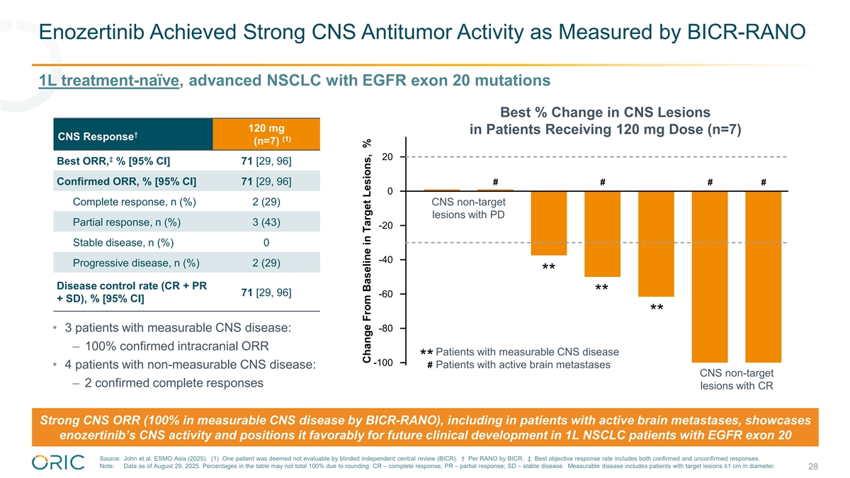 £ £ £ £ * £ £ £ £ £ £ £ ** **** ** Tumor Responses on Enozertinib Were Generally Achieved Early and the Vast Majority of Patients Remain on Treatment 1L treatment-naïve, advanced NSCLC with EGFR exon 20 mutations • Initial cohort of efficacy evaluable patients were treated at 120 mg; given 80% dose reduction rate, most patients effectively received 80 mg • Subsequent cohort of patients were treated at 80 mg; follow-up is still in progress CNS Disease at Baseline Confirmed PR Start Unconfirmed PR Start £ Treatment Ongoing 0 4 8 12 16 20 24 28 32 36 40 44 48 52 56 Time on Treatment, wks • Responses generally occur by 4 weeks, but tumor regression continues over time, with late responses seen after 4+ months on treatment • Median follow-up of 32.6 weeks; 80% (8 of 10) of responders are still on treatment 80% of responders are still on therapy, most at a reduced 80 mg dose; all subsequent enrollment was at 80 mg, with follow-up in progress Source: John et al. ESMO Asia (2025). Note: Data as of August 29, 2025. 27 120 mg QD (n=15)