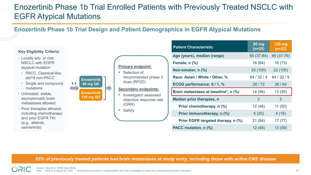 Complete Intracranial and Partial Systemic Responses in a Treatment-Naïve EGFR Exon 20 Mutant NSCLC Patient With Active CNS Metastases Patient: 60-year-old female Prior Therapy: None CNS Metastases at Baseline: 5 active non-target lesions (no prior radiation or surgery) Enozertinib Dose: 120 mg oral, once-daily Systemic Response: Partial response after Cycle 1 Baseline End of Cycle 1 (47% reduction) CNS Response: Complete response after Cycle 1 (disappearance of all 5 CNS lesions) Treatment-Related Adverse Events: Grade 1 paronychia, Grade 2 mucositis, dose reduced to 80 mg for Grade 3 palmar erythrodysesthesia Duration of Treatment: Cycle 6 (ongoing at data cutoff) Baseline End of Cycle 1 Enozertinib demonstrated robust systemic activity and complete intracranial response in a patient with active brain metastases Source: John et al. ESMO Asia (2025). Note: Data as of August 29, 2025. 29