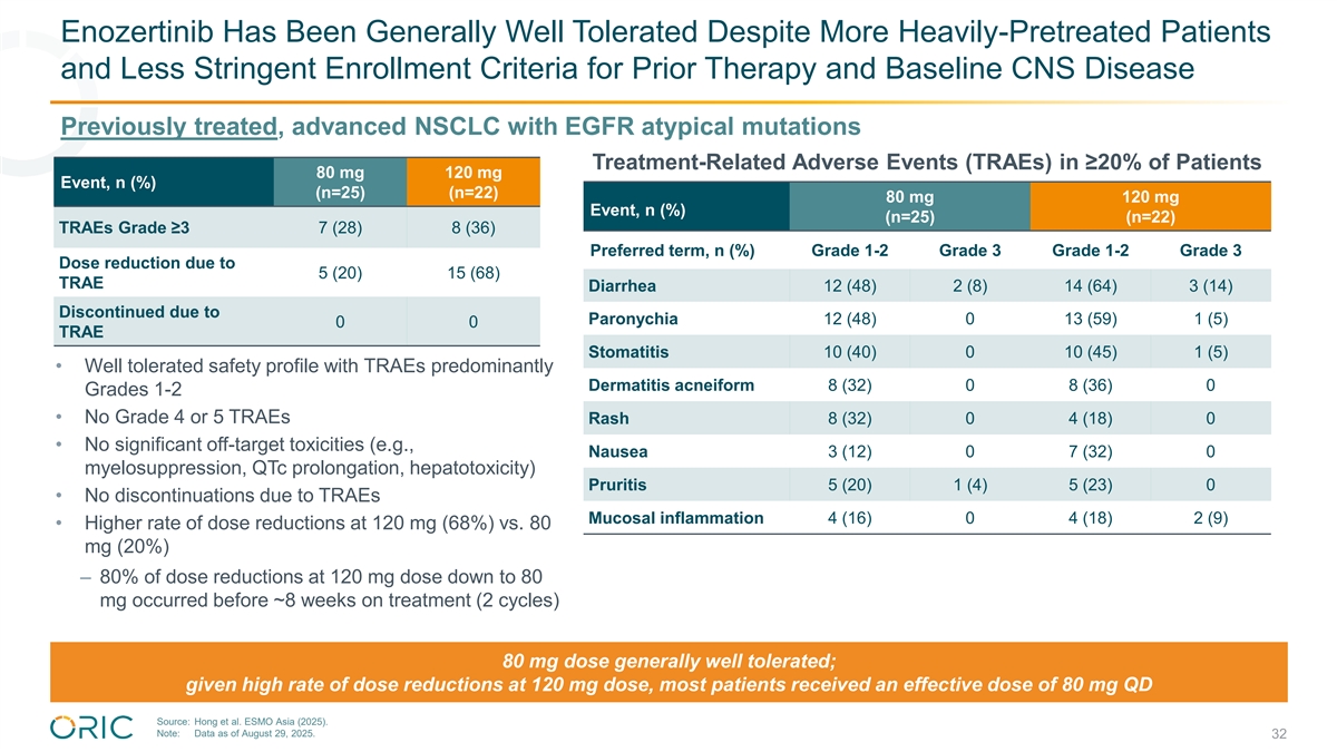 Enozertinib Phase 1b Trial Enrolled Patients with Previously Treated NSCLC with EGFR Atypical Mutations Enozertinib Phase 1b Trial Design and Patient Demographics in EGFR Atypical Mutations 80 mg 120 mg Patient Characteristic (n=25) (n=22) Key Eligibility Criteria: Age (years), median (range) 65 (37-84) 66 (37-76) • Locally adv. or met. NSCLC with EGFR Female, n (%) 16 (64) 16 (73) Primary endpoint: atypical mutation Non-smoker, n (%) 25 (100) 22 (100) • Selection of • PACC, Classical-like, recommended phase 2 Race: Asian / White / Other, % 64 / 32 / 4 64 / 32 / 5 del19 non-PACC Enozertinib dose (RP2D) • Single and compound 1:1 80 mg QD ECOG performance: 0 / 1, % 28 / 72 36 / 64 mutations Secondary endpoints: Brain metastases at baseline*, n (%) 14 (56) 12 (55) Enozertinib • Untreated, stable, • Investigator assessed 120 mg QD asymptomatic brain Median prior therapies, n 2 2 objective response rate metastases allowed (ORR) Prior chemotherapy, n (%) 12 (48) 11 (50) • Prior therapies allowed, • Safety including chemotherapy Prior immunotherapy, n (%) 5 (20) 4 (18) and prior EGFR TKI Prior EGFR targeted therapy, n (%) 21 (84) 17 (77) (e.g., afatinib, osimertinib) PACC mutation, n (%) 12 (48) 13 (59) 55% of previously treated patients had brain metastases at study entry, including those with active CNS disease Source: Hong et al. ESMO Asia (2025). Note: Data as of August 29, 2025. * CNS disease at baseline includes patients with brain metastases at study entry, including active brain metastases. 31