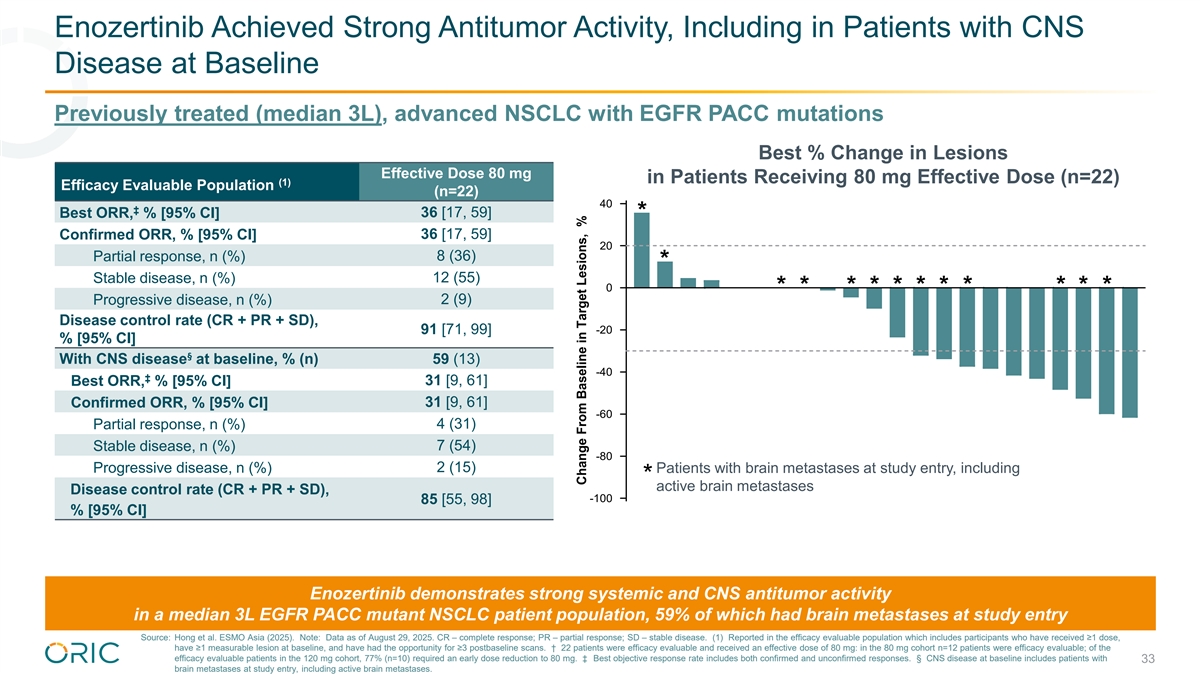 Enozertinib Achieved Strong Antitumor Activity, Including in Patients with CNS Disease at Baseline Previously treated (median 3L), advanced NSCLC with EGFR PACC mutations Best % Change in Lesions Effective Dose 80 mg in Patients Receiving 80 mg Effective Dose (n=22) (1) Efficacy Evaluable Population (n=22) 40 ‡ Best ORR, % [95% CI] 36 [17, 59] * 36 [17, 59] Confirmed ORR, % [95% CI] 20 Partial response, n (%) 8 (36) * 12 (55) Stable disease, n (%) 0 * * * * * * * * * * * Progressive disease, n (%) 2 (9) Disease control rate (CR + PR + SD), -20 91 [71, 99] % [95% CI] § With CNS disease at baseline, % (n) 59 (13) -40 ‡ 31 [9, 61] Best ORR, % [95% CI] Confirmed ORR, % [95% CI] 31 [9, 61] -60 4 (31) Partial response, n (%) Stable disease, n (%) 7 (54) -80 Progressive disease, n (%) 2 (15) Patients with brain metastases at study entry, including * active brain metastases Disease control rate (CR + PR + SD), -100 85 [55, 98] % [95% CI] Enozertinib demonstrates strong systemic and CNS antitumor activity in a median 3L EGFR PACC mutant NSCLC patient population, 59% of which had brain metastases at study entry Source: Hong et al. ESMO Asia (2025). Note: Data as of August 29, 2025. CR – complete response; PR – partial response; SD – stable disease. (1) Reported in the efficacy evaluable population which includes participants who have received ≥1 dose, have ≥1 measurable lesion at baseline, and have had the opportunity for ≥3 postbaseline scans. † 22 patients were efficacy evaluable and received an effective dose of 80 mg: in the 80 mg cohort n=12 patients were efficacy evaluable; of the efficacy evaluable patients in the 120 mg cohort, 77% (n=10) required an early dose reduction to 80 mg. ‡ Best objective response rate includes both confirmed and unconfirmed responses. § CNS disease at baseline includes patients with 33 brain metastases at study entry, including active brain metastases. Change From Baseline in Target Lesions, %