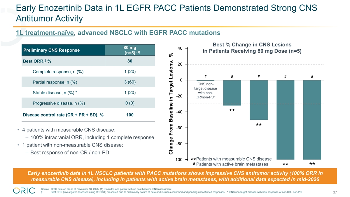 Early Enozertinib Data in 1L EGFR PACC Patients Demonstrated Impressive Antitumor Activity, Including in Patients with CNS Disease at Baseline 1L treatment-naïve, advanced NSCLC with EGFR PACC mutations Best % Change in Lesions 40 in Patients Receiving 80 mg Dose (n=10) 80 mg Preliminary Response Assessment 20 (n=10) ‡ 80 Best ORR, % * * * * * * 0 Partial response, n (%) 8 (80) -20 Stable disease, n (%) 2 (20) Progressive disease, n (%) 0 (0) -40 Disease control rate (CR + PR + SD), % 100 -60 • Safety profile to date in line with 80 mg dose level -80 in other cohorts Patients with brain metastases at study entry, including * active brain metastases -100 Early enozertinib data in 1L NSCLC patients with EGFR PACC mutations shows impressive responses, with additional data expected in mid-2026 Source: ORIC data on file as of November 18, 2025. ‡ Best ORR presented due to preliminary nature of data, and includes confirmed and pending unconfirmed responses. 36 Change From Baseline in Target Lesions, %