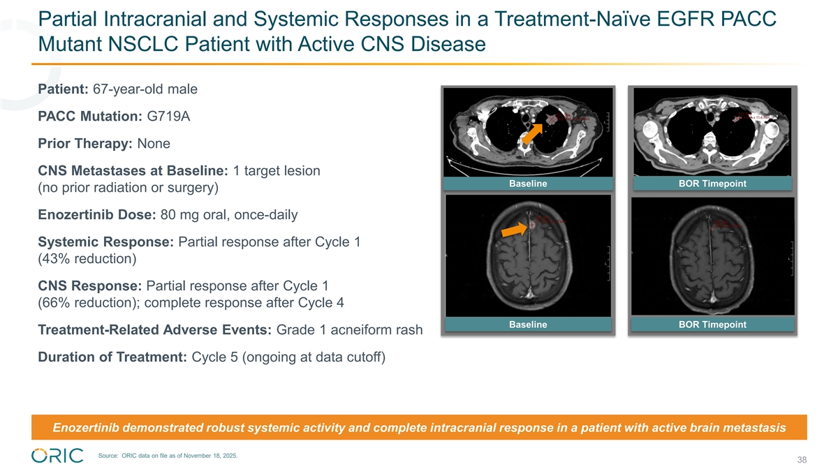 Partial Intracranial and Systemic Responses in a Treatment-Naïve EGFR PACC Mutant NSCLC Patient with Active CNS Disease Patient: 67-year-old male PACC Mutation: G719A Prior Therapy: None CNS Metastases at Baseline: 1 target lesion Baseline BOR Timepoint (no prior radiation or surgery) Enozertinib Dose: 80 mg oral, once-daily Systemic Response: Partial response after Cycle 1 (43% reduction) CNS Response: Partial response after Cycle 1 (66% reduction); complete response after Cycle 4 Baseline BOR Timepoint Treatment-Related Adverse Events: Grade 1 acneiform rash Duration of Treatment: Cycle 5 (ongoing at data cutoff) Enozertinib demonstrated robust systemic activity and complete intracranial response in a patient with active brain metastasis Source: ORIC data on file as of November 18, 2025. 38