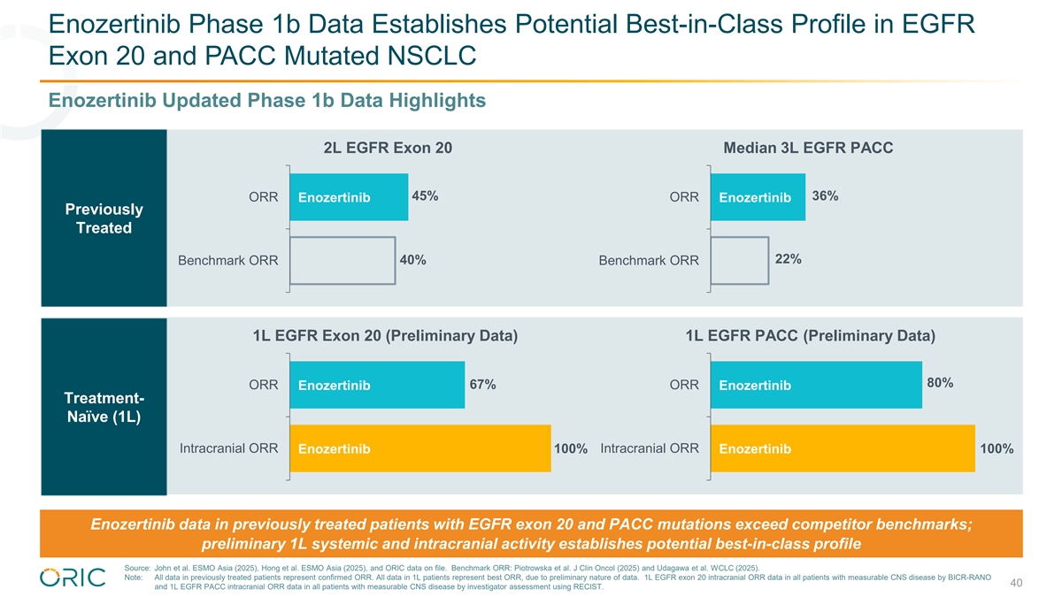 Enozertinib Phase 1b Data Establishes Potential Best-in-Class Profile in EGFR Exon 20 and PACC Mutated NSCLC Enozertinib Updated Phase 1b Data Highlights 2L EGFR Exon 20 Median 3L EGFR PACC 45% 36% ORR ORR Enozertinib Enozertinib Previously Treated 22% 40% Benchmark ORR Benchmark ORR 1L EGFR Exon 20 (Preliminary Data) 1L EGFR PACC (Preliminary Data) 80% ORR 67% ORR Enozertinib Enozertinib Treatment- Naïve (1L) Intracranial ORR Enozertinib 100% Intracranial ORR Enozertinib 100% Enozertinib data in previously treated patients with EGFR exon 20 and PACC mutations exceed competitor benchmarks; preliminary 1L systemic and intracranial activity establishes potential best-in-class profile Source: John et al. ESMO Asia (2025), Hong et al. ESMO Asia (2025), and ORIC data on file. Benchmark ORR: Piotrowska et al. J Clin Oncol (2025) and Udagawa et al. WCLC (2025). Note: All data in previously treated patients represent confirmed ORR. All data in 1L patients represent best ORR, due to preliminary nature of data. 1L EGFR exon 20 intracranial ORR data in all patients with measurable CNS disease by BICR-RANO 9 and 1L EGFR PACC intracranial ORR data in all patients with measurable CNS disease by investigator assessment using RECIST.