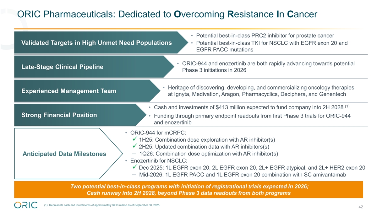 Enozertinib Establishes Potential Best-in-Class Profile in EGFR-Mutated NSCLC Ø Systemic activity in 2L EGFR exon 20 and pretreated EGFR PACC exceeds competitor benchmarks Ø Highly competitive preliminary 1L systemic activity, with 67% ORR in EGFR exon 20 and 80% ORR in EGFR PACC Ø Convincing 1L CNS activity, with 100% intracranial ORR in EGFR exon 20 and 100% intracranial ORR in EGFR PACC, including in patients with active brain metastases Ø Competitive safety profile, with no significant off-target toxicity and manageable on-target toxicity, resulting in low rate of discontinuations Ø 80 mg once-daily selected as recommended dose for potential Phase 3 development Ø Enrollment and follow-up continues in 1L EGFR exon 20 and 1L EGFR PACC with next update (1) expected mid-2026, ahead of potential initiation of Phase 3 trial(s) Source: John et al. ESMO Asia (2025), Hong et al. ESMO Asia (2025), and ORIC data on file. 41 (1) Enrollment in HER2 exon 20 has been completed with no further development planned in this patient population.