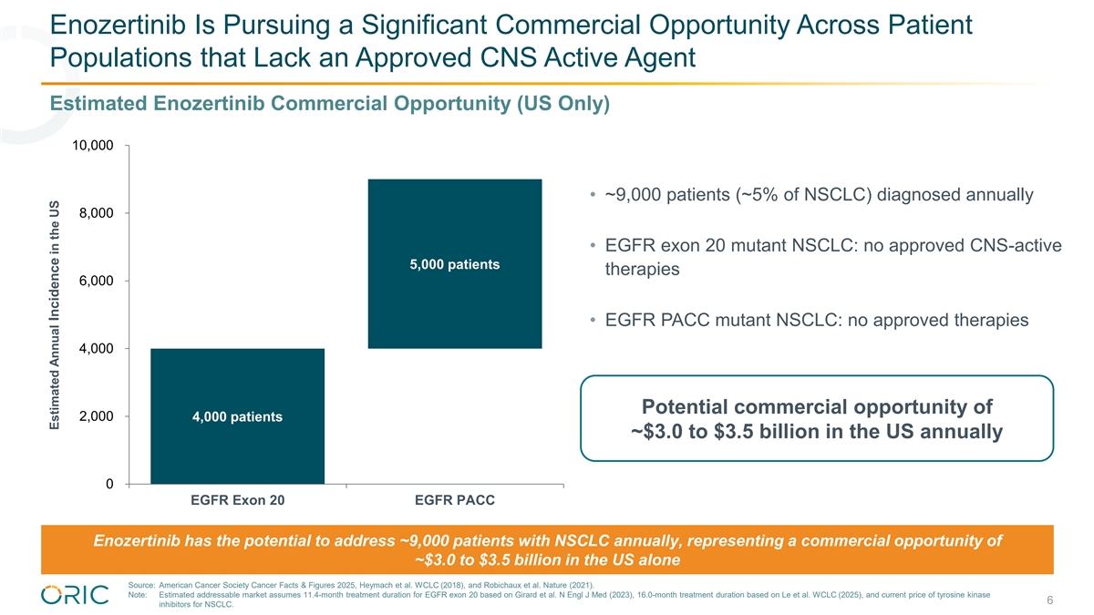 Enozertinib Establishes Potential Best-in-Class Profile in EGFR-Mutated NSCLC Ø Systemic activity in 2L EGFR exon 20 and pretreated EGFR PACC exceeds competitor benchmarks Ø Highly competitive preliminary 1L systemic activity, with 67% ORR in EGFR exon 20 and 80% ORR in EGFR PACC Ø Convincing 1L CNS activity, with 100% intracranial ORR in EGFR exon 20 and 100% intracranial ORR in EGFR PACC, including in patients with active brain metastases Ø Competitive safety profile, with no significant off-target toxicity and manageable on-target toxicity, resulting in low rate of discontinuations Ø 80 mg once-daily selected as recommended dose for potential Phase 3 development Ø Enrollment and follow-up continues in 1L EGFR exon 20 and 1L EGFR PACC with next update (1) expected mid-2026, ahead of potential initiation of Phase 3 trial(s) Source: John et al. ESMO Asia (2025), Hong et al. ESMO Asia (2025), and ORIC data on file. 5 (1) Enrollment in HER2 exon 20 has been completed with no further development planned in this patient population.