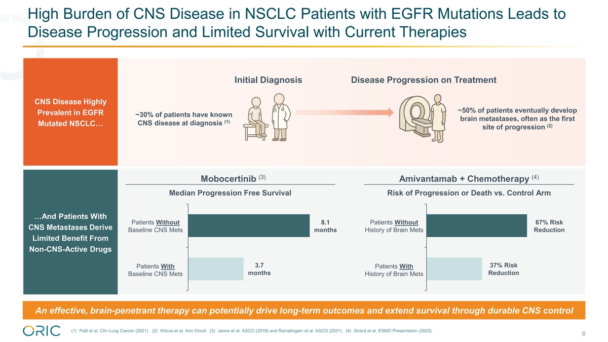Best-in-Class Profile Yet to Emerge in Treatment Landscape for NSCLC Patients Harboring EGFR Exon 20 and EGFR PACC Mutations What is a Best-In-Class Target Product Profile for an EGFR Exon 20 and EGFR PACC Inhibitor? q Manageable on-target toxicities (e.g., GI and skin) Safety / q No significant off-target toxicities (e.g., cardiac, hematologic and liver) Tolerability q Low rate of treatment discontinuations q Strong systemic antitumor activity Systemic and CNSq Treatment of active brain metastases Activity q Prevention of CNS progression Durability of q Strong systemic and CNS activity with a manageable safety profile Response translates to differentiated long-term clinical benefit There remains an unmet need for a highly selective EGFR inhibitor that is also brain-penetrant to effectively treat and prevent intracranial disease 7
