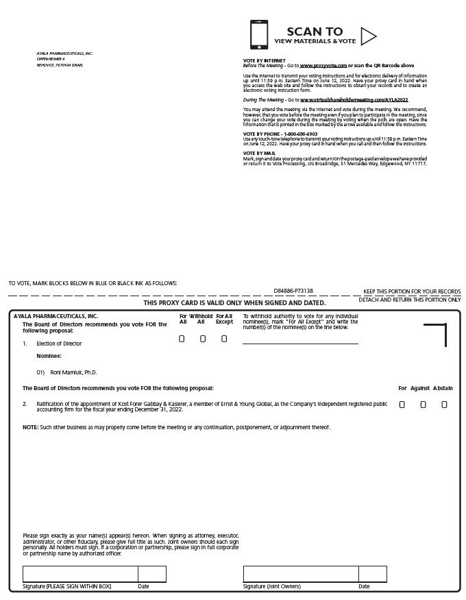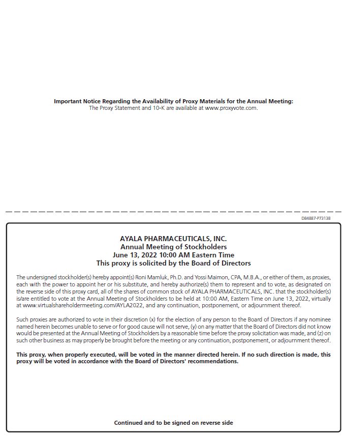 Important Notice Regarding the Availability of Proxy Materials for the Annual Meeting:The Proxy Statement and 10-K are available at www.proxyvote.com. D84887-P73138 AYALA PHARMACEUTICALS, INC. Annual Meeting of Stockholders June 13, 2022 10:00 AM Eastern Time This proxy is solicited by the Board of Directors The undersigned stockholder(s) hereby appoint(s) Roni Mamluk, Ph.D. and Yossi Maimon, CPA, M.B.A., or either of them,