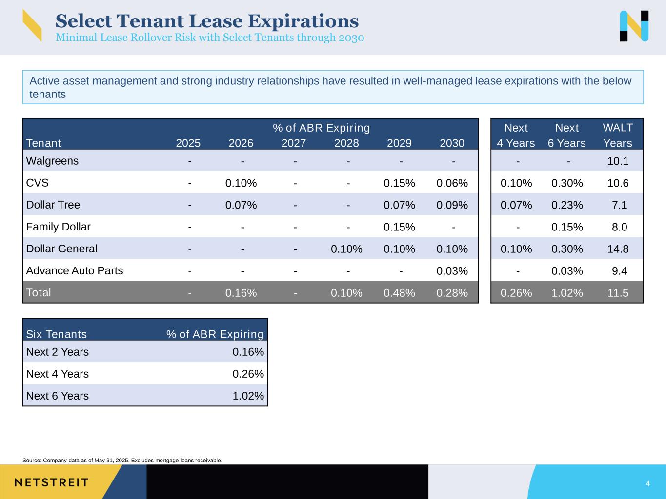 Investment Highlights & Business Update 3 Source: Company data and balance sheet as of March 31, 2025, unless otherwise noted. Figures represent percentage of ABR unless otherwise noted. Due to rounding, respective percentage of credit rating may not precisely reflect the absolute figures. 1. Represents tenants with investment grade credit metrics (more than $1.0 billion in annual sales and a debt to adjusted EBITDA ratio of less than 2.0x), but do not carry a published rating from S&P, Fitch, Moody's, or NAIC. 2. See slides 4, 5, or 14 for further details. 3. Reflects 10,735,647 of unsettled forward equity shares at the March 31, 2025, weighted average net settlement price of $17.18 per share, and an additional $39.5 million of net proceeds ($29.8 million on a forward basis) via ATM sales in 2Q’25 as of June 16, 2025. 4bps Annualized Rent Loss from Credit Events2 99.9% Occupancy 3.8x Unit-Level Rent Coverage2 $624 million Total Liquidity3 4.5x Adj. Net Debt3 / Annualized Adj. EBITDAre ✓Focused on growing portfolio with high quality tenants that offer strong credit profiles and provide consistent performance through various economic cycles ✓Proven track record of full occupancy and strong unit-level coverage; NTST’s lone vacancy has received strong interest from multiple retailers at or above current rent ✓Long weighted average lease term and de minimis intermediate-term lease expirations within the pharmacy and dollar store industries ✓Low leverage with no immediate-term debt maturities ✓$184.5 million of unsettled forward equity at 1Q’25-end ✓Strong liquidity to provide ample runway for 2025 investments ✓$39.5 million of net proceeds generated via ATM sales quarter-to-date in 2Q’25 High Credit Quality & Resilient Net Lease Portfolio Well Capitalized Balance Sheet 71% Investment Grade (IG) and Investment Grade Profile (IGP)1 7.0% Wtd. Avg. Cash Yield Since 3Q’20 ✓Strong investment pace since 2020 with a solid pipeline of investment opportunities at attractive cash yields ✓$90.7 million of gross investments completed in 1Q’25 Proven Ability to Source Attractive Investment Opportunities 2028 First Term Loan Maturity $104 million Avg. Net Investments Per Quarter Since 3Q’20 27% Adj. Net Debt3 / Undepreciated Gross Assets $46 million YTD Net Investments 7.7% YTD Cash Yield 9.7 Years Weighted Average Lease Term (WALT) 26bps Pharmacy & Dollar Store ABR2 Expiring Thru YE’28