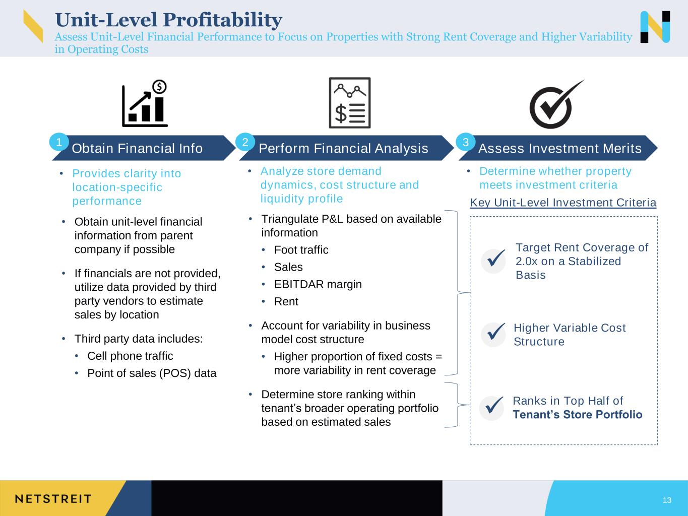 12 Market-Level Considerations Property-Level Considerations • Fungibility of building for alternative uses • Replacement cost • Location analysis • Traffic counts • Nearby uses and traffic drivers, complementary nature thereof • Accessibility and parking capacity • Ingress and egress • Visibility / signage • Vacancy analysis • Marketability of the real estate without current tenant • List of likely replacement tenants • Rent analysis • Market rent versus in-place rent • Demographic analysis • Current demographics plus trends and forecasts • Competitive analysis • Market position versus competing retail corridors Real Estate Valuation Real Estate Closely Follows Credit as a Top Priority: We Utilize a Ground-Up Framework Rooted in Real Estate Fundamentals to Underpin Valuation and Further Quantify the Upside Potential of an Investment