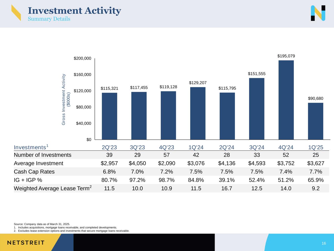 15 Source: Company filings from August 2020 through March 31, 2025. 1. Investments with investment grade credit metrics (more than $1.0 billion in annual sales and a debt to adjusted EBITDA ratio of less than 2.0x), but do not carry a published rating from S&P, Fitch, Moody’s, or NAIC. 2. Excludes lease extension options and investments that secure mortgage loans receivable. 3. Assumes cash cap rate is 30bps lower than reported GAAP cap rate. Gross Volume ($ in millions) $2,301 $6,230 $3,127 $1,348 $4,848 Investment Grade % 62.4% 67.6% NA 54.8% NA Investment Grade Profile1 % 15.5% NA NA NA NA IG + IG Profile % 77.9% NA NA NA NA WALT2 11.3 10.0 11.5 11.0 15.2 Weighted Average Cash Yield 7.0% 6.4%3 7.0% 6.7% 7.5% History of Sourcing Investments at Attractive Yields Consistently Invested at Above-Market Yields Despite Focus on High-Quality Tenants Sourcing Volume Since 3Q’20