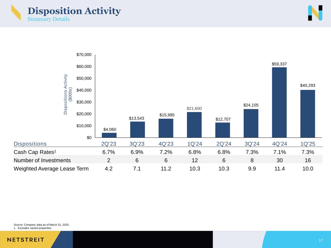 $115,321 $117,455 $119,128 $129,207 $115,795 $151,555 $195,079 $90,680 $0 $40,000 $80,000 $120,000 $160,000 $200,000 2Q'23 3Q'23 4Q'23 1Q'24 2Q'24 3Q'24 4Q'24 1Q'25 G ro s s I n v e s tm e n t A c ti v it y ($ 0 0 0 s ) 16 Investment Activity Summary Details Source: Company data as of March 31, 2025. 1. Includes acquisitions, mortgage loans receivable, and completed developments. 2. Excludes lease extension options and investments that secure mortgage loans receivable. Investments1 2Q'23 3Q'23 4Q'23 1Q'24 2Q'24 3Q'24 4Q'24 1Q'25 Number of Investments 39 29 57 42 28 33 52 25 Average Investment $2,957 $4,050 $2,090 $3,076 $4,136 $4,593 $3,752 $3,627 Cash Cap Rates 6.8% 7.0% 7.2% 7.5% 7.5% 7.5% 7.4% 7.7% IG + IGP % 80.7% 97.2% 98.7% 84.8% 39.1% 52.4% 51.2% 65.9% Weighted Average Lease Term2 11.5 10.0 10.9 11.5 16.7 12.5 14.0 9.2