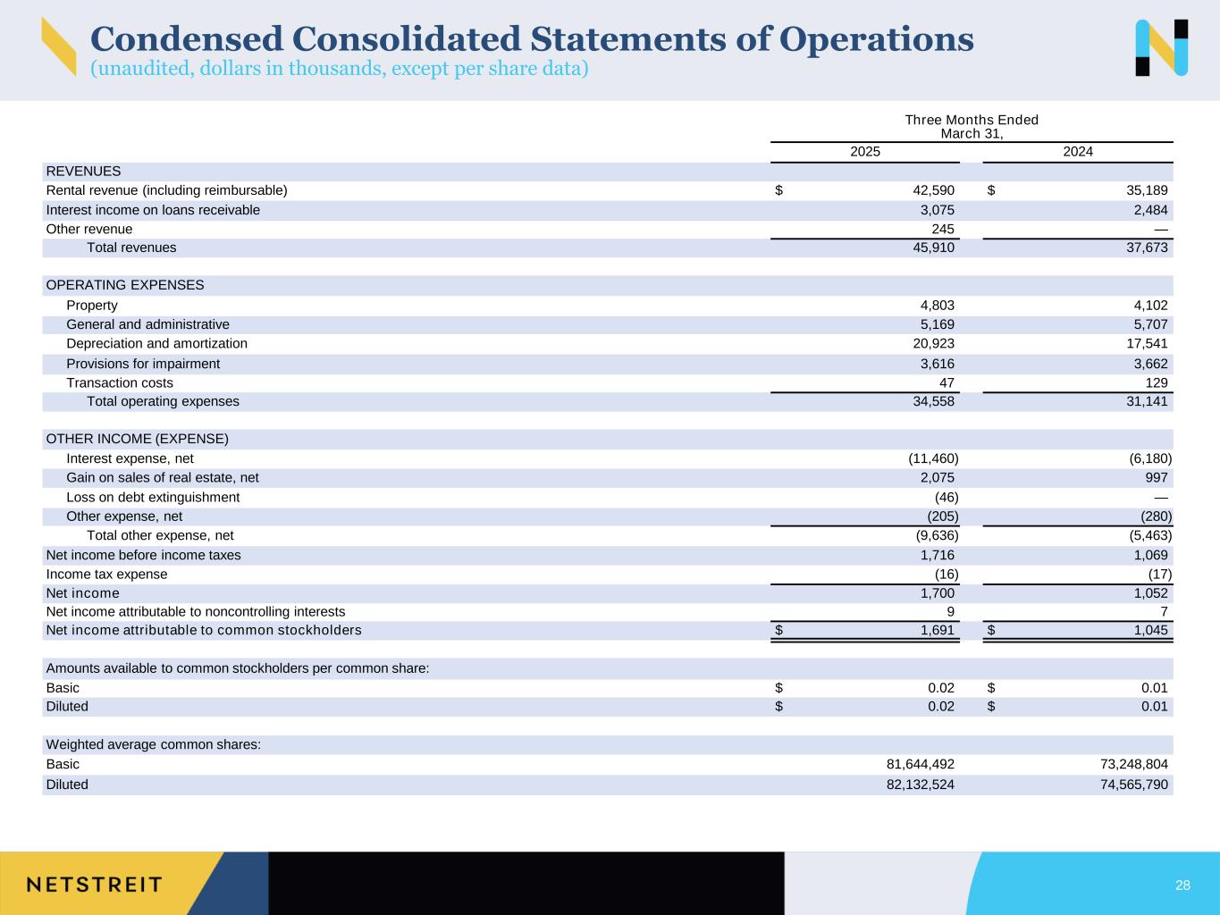 Three Months Ended March 31, 2025 2024 REVENUES Rental revenue (including reimbursable) $ 42,590 $ 35,189 Interest income on loans receivable 3,075 2,484 Other revenue 245 — Total revenues 45,910 37,673 OPERATING EXPENSES Property 4,803 4,102 General and administrative 5,169 5,707 Depreciation and amortization 20,923 17,541 Provisions for impairment 3,616 3,662 Transaction costs 47 129 Total operating expenses 34,558 31,141 OTHER INCOME (EXPENSE) Interest expense, net (11,460) (6,180) Gain on sales of real estate, net 2,075 997 Loss on debt extinguishment (46) — Other expense, net (205) (280) Total other expense, net (9,636) (5,463) Net income before income taxes 1,716 1,069 Income tax expense (16) (17) Net income 1,700 1,052 Net income attributable to noncontrolling interests 9 7 Net income attributable to common stockholders $ 1,691 $ 1,045 Amounts available to common stockholders per common share: Basic $ 0.02 $ 0.01 Diluted $ 0.02 $ 0.01 Weighted average common shares: Basic 81,644,492 73,248,804 Diluted 82,132,524 74,565,790 28 Condensed Consolidated Statements of Operations (unaudited, dollars in thousands, except per share data)