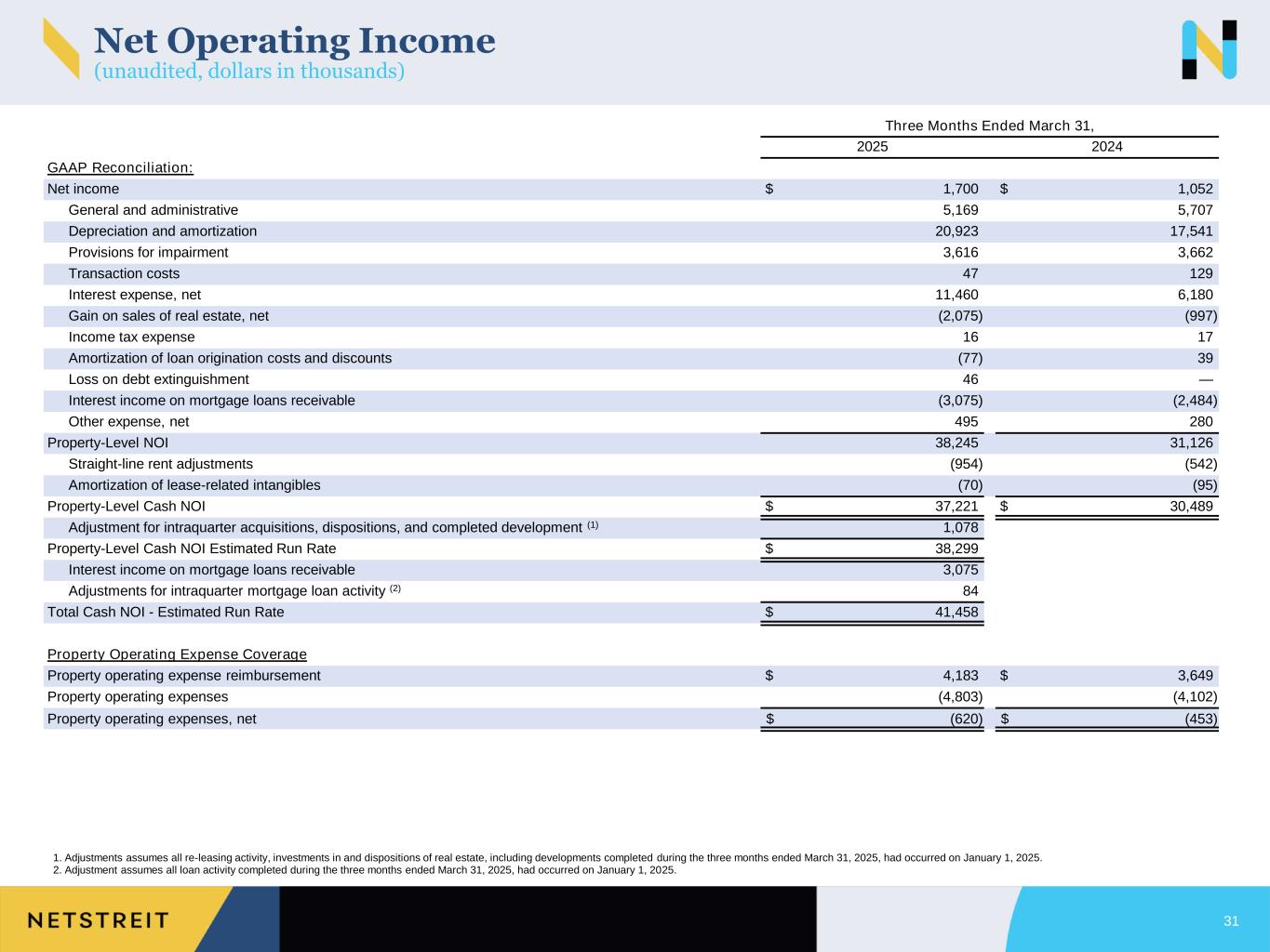 1. Adjustments assumes all re-leasing activity, investments in and dispositions of real estate, including developments completed during the three months ended March 31, 2025, had occurred on January 1, 2025. 2. Adjustment assumes all loan activity completed during the three months ended March 31, 2025, had occurred on January 1, 2025. Three Months Ended March 31, 2025 2024 GAAP Reconciliation: Net income $ 1,700 $ 1,052 General and administrative 5,169 5,707 Depreciation and amortization 20,923 17,541 Provisions for impairment 3,616 3,662 Transaction costs 47 129 Interest expense, net 11,460 6,180 Gain on sales of real estate, net (2,075) (997) Income tax expense 16 17 Amortization of loan origination costs and discounts (77) 39 Loss on debt extinguishment 46 — Interest income on mortgage loans receivable (3,075) (2,484) Other expense, net 495 280 Property-Level NOI 38,245 31,126 Straight-line rent adjustments (954) (542) Amortization of lease-related intangibles (70) (95) Property-Level Cash NOI $ 37,221 $ 30,489 Adjustment for intraquarter acquisitions, dispositions, and completed development (1) 1,078 Property-Level Cash NOI Estimated Run Rate $ 38,299 Interest income on mortgage loans receivable 3,075 Adjustments for intraquarter mortgage loan activity (2) 84 Total Cash NOI - Estimated Run Rate $ 41,458 Property Operating Expense Coverage Property operating expense reimbursement $ 4,183 $ 3,649 Property operating expenses (4,803) (4,102) Property operating expenses, net $ (620) $ (453) 31 Net Operating Income (unaudited, dollars in thousands)
