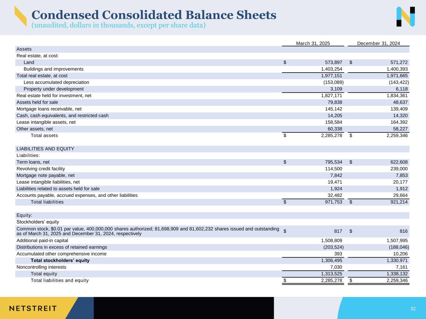 March 31, 2025 December 31, 2024 Assets Real estate, at cost: Land $ 573,897 $ 571,272 Buildings and improvements 1,403,254 1,400,393 Total real estate, at cost 1,977,151 1,971,665 Less accumulated depreciation (153,089) (143,422) Property under development 3,109 6,118 Real estate held for investment, net 1,827,171 1,834,361 Assets held for sale 79,838 48,637 Mortgage loans receivable, net 145,142 139,409 Cash, cash equivalents, and restricted cash 14,205 14,320 Lease intangible assets, net 158,584 164,392 Other assets, net 60,338 58,227 Total assets $ 2,285,278 $ 2,259,346 LIABILITIES AND EQUITY Liabilities: Term loans, net $ 795,534 $ 622,608 Revolving credit facility 114,500 239,000 Mortgage note payable, net 7,842 7,853 Lease intangible liabilities, net 19,471 20,177 Liabilities related to assets held for sale 1,924 1,912 Accounts payable, accrued expenses, and other liabilities 32,482 29,664 Total liabilities $ 971,753 $ 921,214 Equity: Stockholders’ equity Common stock, $0.01 par value, 400,000,000 shares authorized; 81,698,909 and 81,602,232 shares issued and outstanding as of March 31, 2025 and December 31, 2024, respectively $ 817 $ 816 Additional paid-in capital 1,508,809 1,507,995 Distributions in excess of retained earnings (203,524) (188,046) Accumulated other comprehensive income 393 10,206 Total stockholders’ equity 1,306,495 1,330,971 Noncontrolling interests 7,030 7,161 Total equity 1,313,525 1,338,132 Total liabilities and equity $ 2,285,278 $ 2,259,346 32 Condensed Consolidated Balance Sheets (unaudited, dollars in thousands, except per share data)