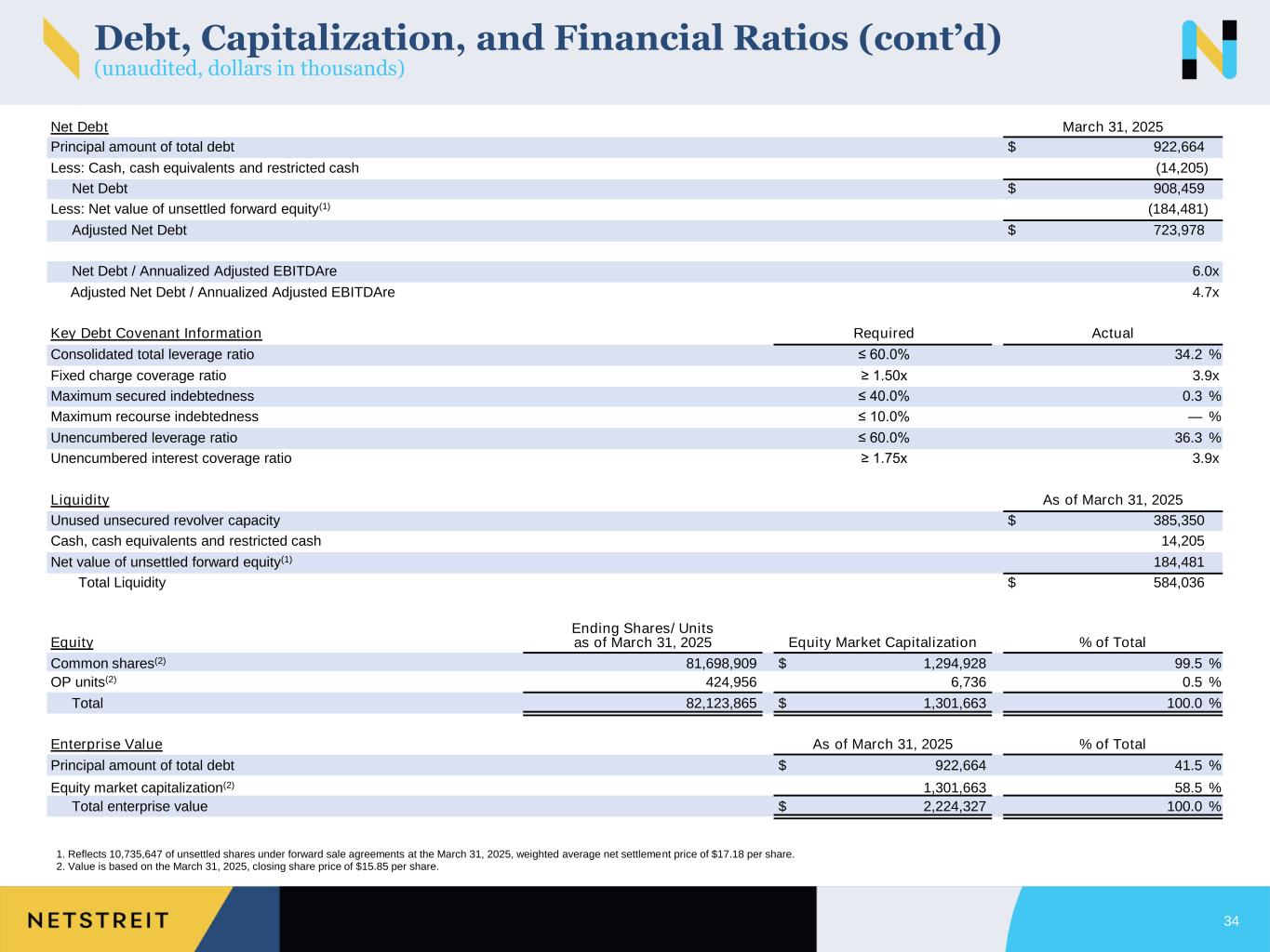1. Reflects 10,735,647 of unsettled shares under forward sale agreements at the March 31, 2025, weighted average net settlement price of $17.18 per share. 2. Value is based on the March 31, 2025, closing share price of $15.85 per share. 34 Debt, Capitalization, and Financial Ratios (cont’d) (unaudited, dollars in thousands) Net Debt March 31, 2025 Principal amount of total debt $ 922,664 Less: Cash, cash equivalents and restricted cash (14,205) Net Debt $ 908,459 Less: Net value of unsettled forward equity(1) (184,481) Adjusted Net Debt $ 723,978 Net Debt / Annualized Adjusted EBITDAre 6.0x Adjusted Net Debt / Annualized Adjusted EBITDAre 4.7x Key Debt Covenant Information Required Actual Consolidated total leverage ratio ≤ 60.0% 34.2 % Fixed charge coverage ratio ≥ 1.50x 3.9x Maximum secured indebtedness ≤ 40.0% 0.3 % Maximum recourse indebtedness ≤ 10.0% — % Unencumbered leverage ratio ≤ 60.0% 36.3 % Unencumbered interest coverage ratio ≥ 1.75x 3.9x Liquidity As of March 31, 2025 Unused unsecured revolver capacity $ 385,350 Cash, cash equivalents and restricted cash 14,205 Net value of unsettled forward equity(1) 184,481 Total Liquidity $ 584,036 Equity Ending Shares/ Units as of March 31, 2025 Equity Market Capitalization % of Total Common shares(2) 81,698,909 $ 1,294,928 99.5 % OP units(2) 424,956 6,736 0.5 % Total 82,123,865 $ 1,301,663 100.0 % Enterprise Value As of March 31, 2025 % of Total Principal amount of total debt $ 922,664 41.5 % Equity market capitalization(2) 1,301,663 58.5 % Total enterprise value $ 2,224,327 100.0 %