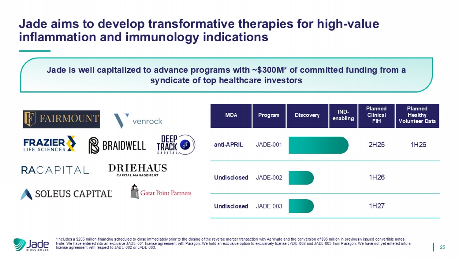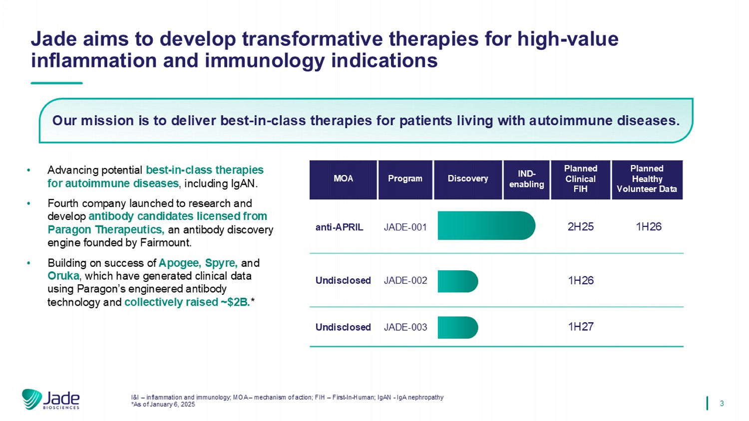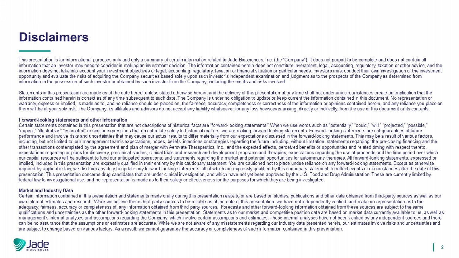 2 This presentation is for informational purposes only and only a summary of certain information related to Jade Biosciences, I nc. (the “Company”). It does not purport to be complete and does not contain all information that an investor may need to consider in making an investment decision. The information contained herein does not co nstitute investment, legal, accounting, regulatory, taxation or other advice, and the information does not take into account your investment objectives or legal, accounting, regulatory, taxation or financial sit uat ion or particular needs. Investors must conduct their own investigation of the investment opportunity and evaluate the risks of acquiring the Company securities based solely upon such investor’s independent examinat ion and judgment as to the prospects of the Company as determined from information in the possession of such investor or obtained by such investor from the Company, including the merits and risks inv olved. Statements in this presentation are made as of the date hereof unless stated otherwise herein, and the delivery of this prese nta tion at any time shall not under any circumstances create an implication that the information contained herein is correct as of any time subsequent to such date. The Company is under no obligation to update or keep current the information contained in this document. No representation or warranty, express or implied, is made as to, and no reliance should be placed on, the fairness, accuracy, completeness or cor rec tness of the information or opinions contained herein, and any reliance you place on them will be at your sole risk. The Company, its affiliates and advisors do not accept any liability whatsoever for any loss how soever arising, directly or indirectly, from the use of this document or its contents. Forward - looking statements and other information Certain statements contained in this presentation that are not descriptions of historical facts are “forward - looking statements. ” When we use words such as “potentially,” “could,” “will,” “projected,” “possible,” “expect,” “illustrative,” “estimated” or similar expressions that do not relate solely to historical matters, we are making f orw ard - looking statements. Forward - looking statements are not guarantees of future performance and involve risks and uncertainties that may cause our actual results to differ materially from our expectations dis cussed in the forward - looking statements. This may be a result of various factors, including, but not limited to: our management team’s expectations, hopes, beliefs, intentions or strategies regarding the fut ure including, without limitation, statements regarding: the pre - closing financing and the other transactions contemplated by the agreement and plan of merger with Aerovate Therapeutics, Inc., and the expected effect s, perceived benefits or opportunities and related timing with respect thereto, expectations regarding or plans for discovery, preclinical studies, clinical trials and research and development programs and th erapies; expectations regarding the use of proceeds and the time period over which our capital resources will be sufficient to fund our anticipated operations; and statements regarding the market and potentia l o pportunities for autoimmune therapies. All forward - looking statements, expressed or implied, included in this presentation are expressly qualified in their entirety by this cautionary statement. You are cautio ned not to place undue reliance on any forward - looking statements. Except as otherwise required by applicable law, we disclaim any duty to update any forward - looking statements, all of which are expressly qualified by this cautionary statement, to reflect events or circumstances after the date of this presentation. This presentation concerns drug candidates that are under clinical investigation, and which have not yet been a ppr oved by the U.S. Food and Drug Administration. These are currently limited by federal law to investigational use, and no representation is made as to their safety or effectiveness for the purposes for wh ich they are being investigated. Market and Industry Data Certain information contained in this presentation and statements made orally during this presentation relate to or are based on studies, publications and other data obtained from third - party sources as well as our own internal estimates and research. While we believe these third - party sources to be reliable as of the date of this presentati on, we have not independently verified, and make no representation as to the adequacy, fairness, accuracy or completeness of, any information obtained from third party sources. Forecasts and other forw ard - looking information obtained from these sources are subject to the same qualifications and uncertainties as the other forward - looking statements in this presentation. Statements as to our market and c ompetitive position data are based on market data currently available to us, as well as management’s internal analyses and assumptions regarding the Company, which involve certain assumptions and estimates. These int ernal analyses have not been verified by any independent sources and there can be no assurance that the assumptions or estimates are accurate. While we are not aware of any misstatements regarding our in dustry data presented herein, our estimates involve risks and uncertainties and are subject to change based on various factors. As a result, we cannot guarantee the accuracy or completeness of such informa tio n contained in this presentation. Disclaimers