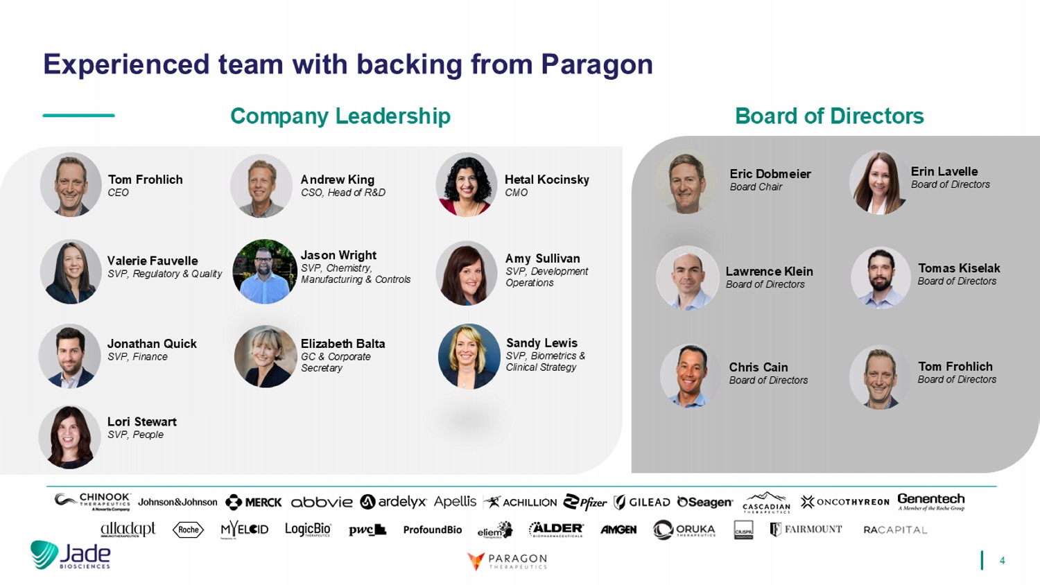 3 • Advancing potential best - in - class therapies for autoimmune diseases , including IgAN. • Fourth company launched to research and develop antibody candidates licensed from Paragon Therapeutics, an antibody discovery engine founded by Fairmount. • Building on success of Apogee, Spyre, and Oruka , which have generated clinical data using Paragon’s engineered antibody technology and collectively raised ~$2B. * Jade aims to develop transformative therapies for high - value inflammation and immunology indications Our mission is to deliver best - in - class therapies for patients living with autoimmune diseases. I&I – inflammation and immunology; MOA – mechanism of action; FIH – First - In - Human; IgAN - IgA nephropathy *As of January 6, 2025 Planned Healthy Volunteer Data Planned Clinical FIH IND - enabling Discovery Program MOA 1H26 2H25 JADE - 001 anti - APRIL 1H26 JADE - 002 Undisclosed 1H27 JADE - 003 Undisclosed