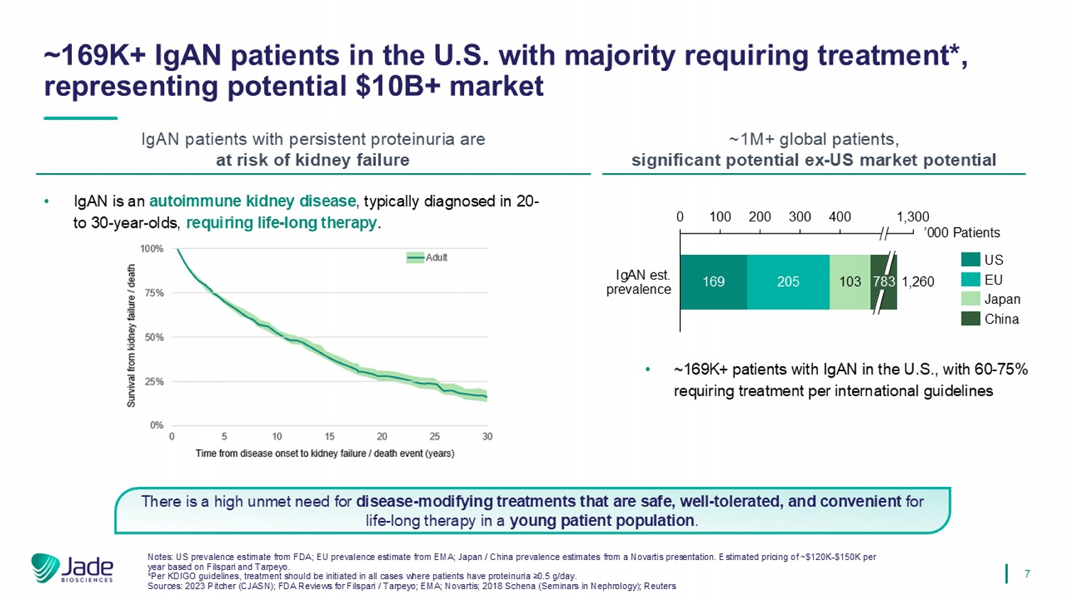 6 HV – Healthy Volunteers; PoC – proof of concept Jade is developing a potential best - in - class anti - APRIL mAb designed to have disease - modifying MoA in IgAN CONFIDENTIAL Estimated $10B+ branded market Current treatments do not adequately address the need for long - term disease - modifying therapy in a typically young IgAN patient population Mechanism has potential to be disease modifying, reducing pathogenic IgA and proteinuria, stabilizing kidney function Potential best - in - class profile JADE - 001 designed for superior potency and extended half - life for maximal efficacy & convenient dosing for life - long therapy Efficient path to PoC and market HV IgA biomarker linked with efficacy in IgAN; surrogate endpoints support potential IgAN approval Anti - APRIL class poised to be the dominant treatment for IgAN