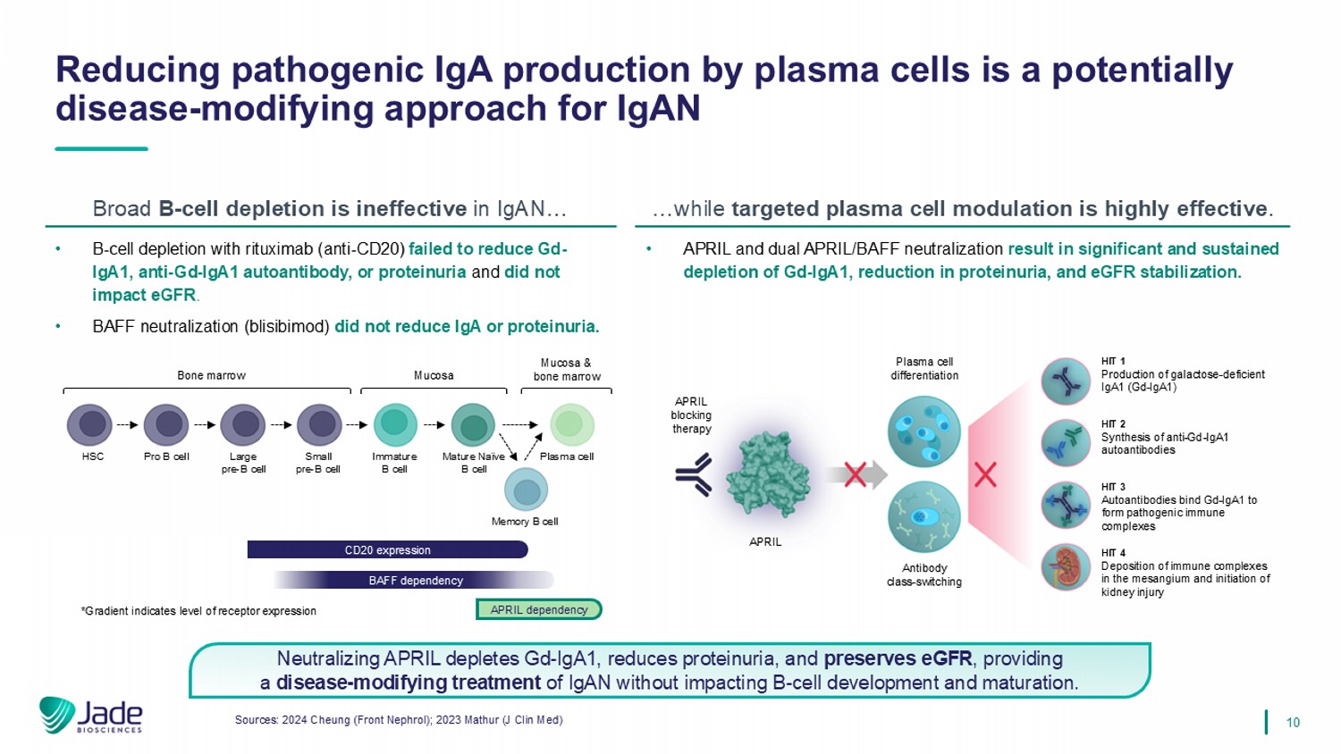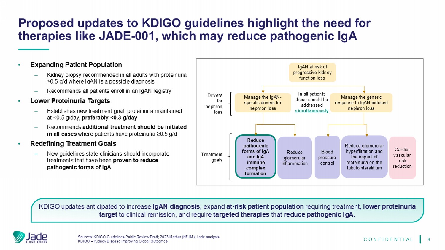 9 Sources: KDIGO Guidelines Public Review Draft; 2023 Mathur (NEJM); Jade analysis KDIGO – Kidney Disease Improving Global Outcomes Proposed updates to KDIGO guidelines highlight the need for therapies like JADE - 001, which may reduce pathogenic IgA CONFIDENTIAL KDIGO updates anticipated to increase IgAN diagnosis , expand at - risk patient population requiring treatment , lower proteinuria target to clinical remission, and require targeted therapies that reduce pathogenic IgA. IgAN at risk of progressive kidney function loss Manage the IgAN - specific drivers for nephron loss Manage the generic response to IgAN - induced nephron loss Drivers for nephron loss In all patients these should be addressed simultaneously Reduce pathogenic forms of IgA and IgA immune complex formation Reduce glomerular inflammation Blood pressure control Reduce glomerular hyperfiltration and the impact of proteinuria on the tubulointerstitium Cardio - vascular risk reduction • Expanding Patient Population ‒ Kidney biopsy recommended in all adults with proteinuria ≥0.5 g/d where IgAN is a possible diagnosis ‒ Recommends all patients enroll in an IgAN registry • Lower Proteinuria Targets ‒ Establishes new treatment goal: proteinuria maintained at <0.5 g/day, preferably <0.3 g/day ‒ Recommends additional treatment should be initiated in all cases where patients have proteinuria ≥0.5 g/d • Redefining Treatment Goals ‒ New guidelines state clinicians should incorporate treatments that have been proven to reduce pathogenic forms of IgA Treatment goals