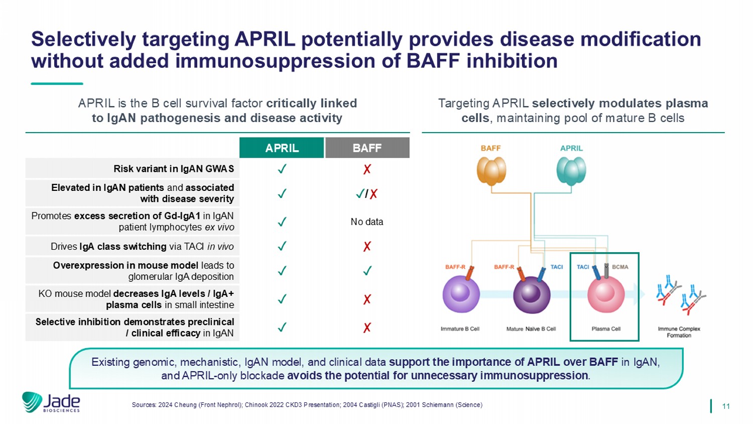 10 APRIL dependency HSC Pro B cell Large pre - B cell Small pre - B cell Immature B cell Mature Naïve B cell Memory B cell Plasma cell Bone marrow Mucosa Mucosa & bone marrow CD20 expression BAFF dependency *Gradient indicates level of receptor expression Sources: 2024 Cheung (Front Nephrol); 2023 Mathur (J Clin Med) Reducing pathogenic IgA production by plasma cells is a potentially disease - modifying approach for IgAN Broad B - cell depletion is ineffective in IgAN… …while targeted plasma cell modulation is highly effective . • B - cell depletion with rituximab (anti - CD20) failed to reduce Gd - IgA1, anti - Gd - IgA1 autoantibody, or proteinuria and did not impact eGFR . • BAFF neutralization (blisibimod) did not reduce IgA or proteinuria. • APRIL and dual APRIL/BAFF neutralization result in significant and sustained depletion of Gd - IgA1, reduction in proteinuria, and eGFR stabilization. APRIL APRIL blocking therapy Plasma cell differentiation Antibody class - switching HIT 1 Production of galactose - deficient IgA1 (Gd - IgA1) HIT 2 Synthesis of anti - Gd - IgA1 autoantibodies HIT 3 Autoantibodies bind Gd - IgA1 to form pathogenic immune complexes HIT 4 Deposition of immune complexes in the mesangium and initiation of kidney injury Neutralizing APRIL depletes Gd - IgA1, reduces proteinuria, and preserves eGFR , providing a disease - modifying treatment of IgAN without impacting B - cell development and maturation.
