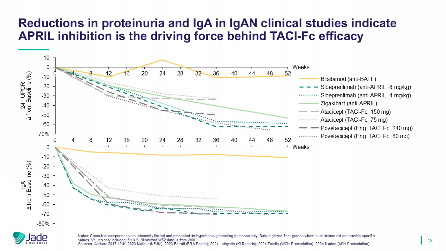 11 Existing genomic, mechanistic, IgAN model, and clinical data support the importance of APRIL over BAFF in IgAN, and APRIL - only blockade avoids the potential for unnecessary immunosuppression . Selectively targeting APRIL potentially provides disease modification without added immunosuppression of BAFF inhibition Sources: 2024 Cheung (Front Nephrol); Chinook 2022 CKD3 Presentation; 2004 Castigli (PNAS); 2001 Schiemann (Science) BAFF APRIL ✗ ✓ Risk variant in IgAN GWAS ✓ / ✗ ✓ Elevated in IgAN patients and associated with disease severity No data ✓ Promotes excess secretion of Gd - IgA1 in IgAN patient lymphocytes ex vivo ✗ ✓ Drives IgA class switching via TACI in vivo ✓ ✓ Overexpression in mouse model leads to glomerular IgA deposition ✗ ✓ KO mouse model decreases IgA levels / IgA+ plasma cells in small intestine ✗ ✓ Selective inhibition demonstrates preclinical / clinical efficacy in IgAN APRIL is the B cell survival factor critically linked to IgAN pathogenesis and disease activity Targeting APRIL selectively modulates plasma cells , maintaining pool of mature B cells