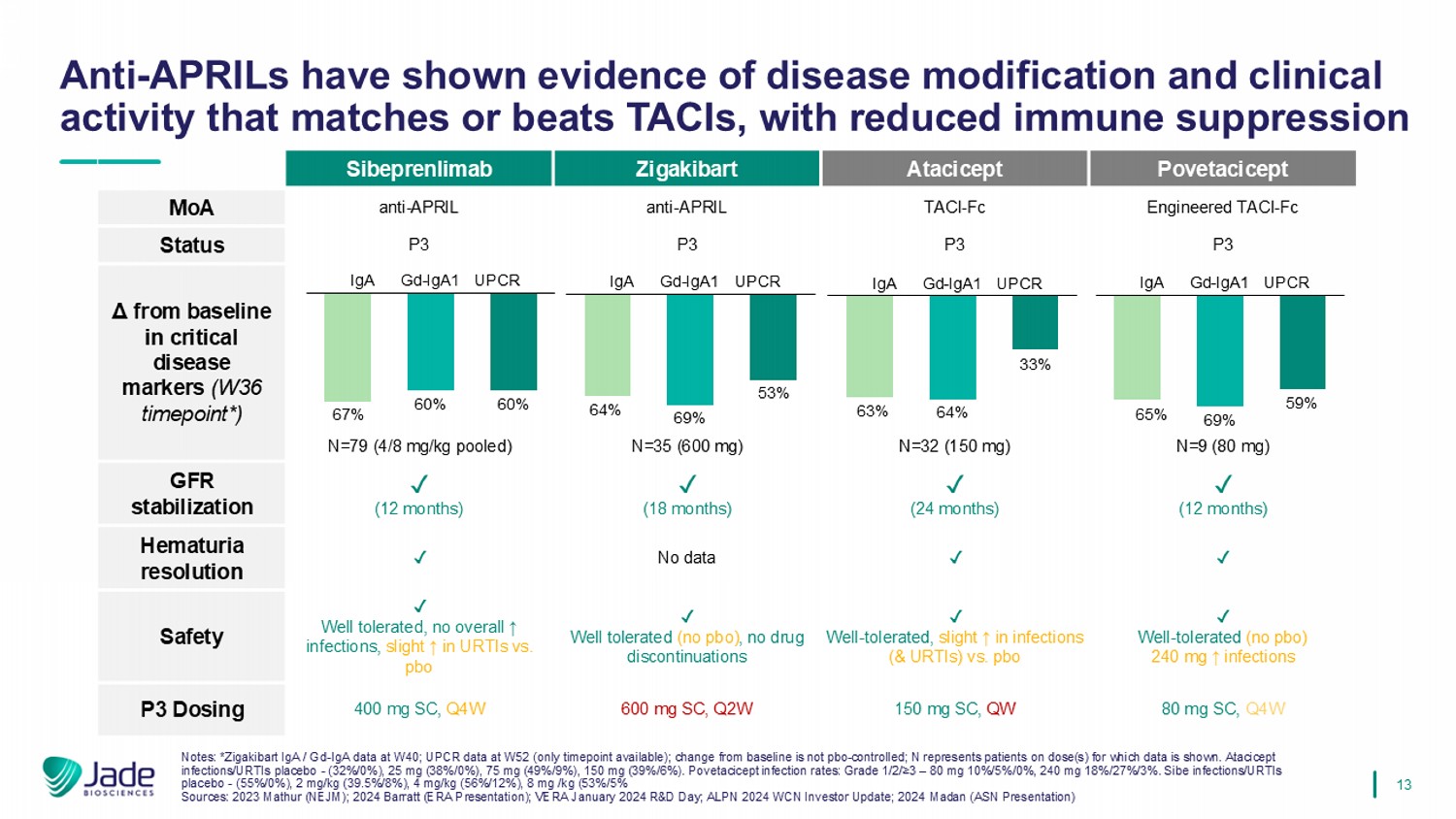 12 Reductions in proteinuria and IgA in IgAN clinical studies indicate APRIL inhibition is the driving force behind TACI - Fc efficacy Notes: Cross - trial comparisons are inherently limited and presented for hypothesis - generating purposes only. Data digitized from graphs where publications did not provide specific values. Values only included if N > 5. Blisibimod W52 data is from W60. Sources: Anthera 2017 10 - K; 2023 Mathur (NEJM); 2023 Barratt (ERA Poster); 2024 Lafayette (KI Reports); 2024 Tumlin (WCN Presentation); 2024 Madan (ASN Presentation) 0 4 8 12 16 20 24 28 32 36 40 44 48 52 - 70 % - 60 - 50 - 40 - 30 - 20 - 10 0 10 Weeks 24h UPCR Δ from Baseline (%) Blisibimod (anti - BAFF) Sibeprenlimab (anti - APRIL, 8 mg/kg) Sibeprenlimab (anti - APRIL, 4 mg/kg) Zigakibart (anti - APRIL) Atacicept (TACI - Fc, 150 mg) Atacicept (TACI - Fc, 75 mg) Povetacicept (Eng. TACI - Fc, 240 mg) Povetacicept (Eng. TACI - Fc, 80 mg) 0 4 8 12 16 20 24 28 32 36 40 44 48 52 - 70 - 60 - 50 - 40 - 30 - 20 - 10 0 - 80 % Weeks IgA Δ from Baseline (%)