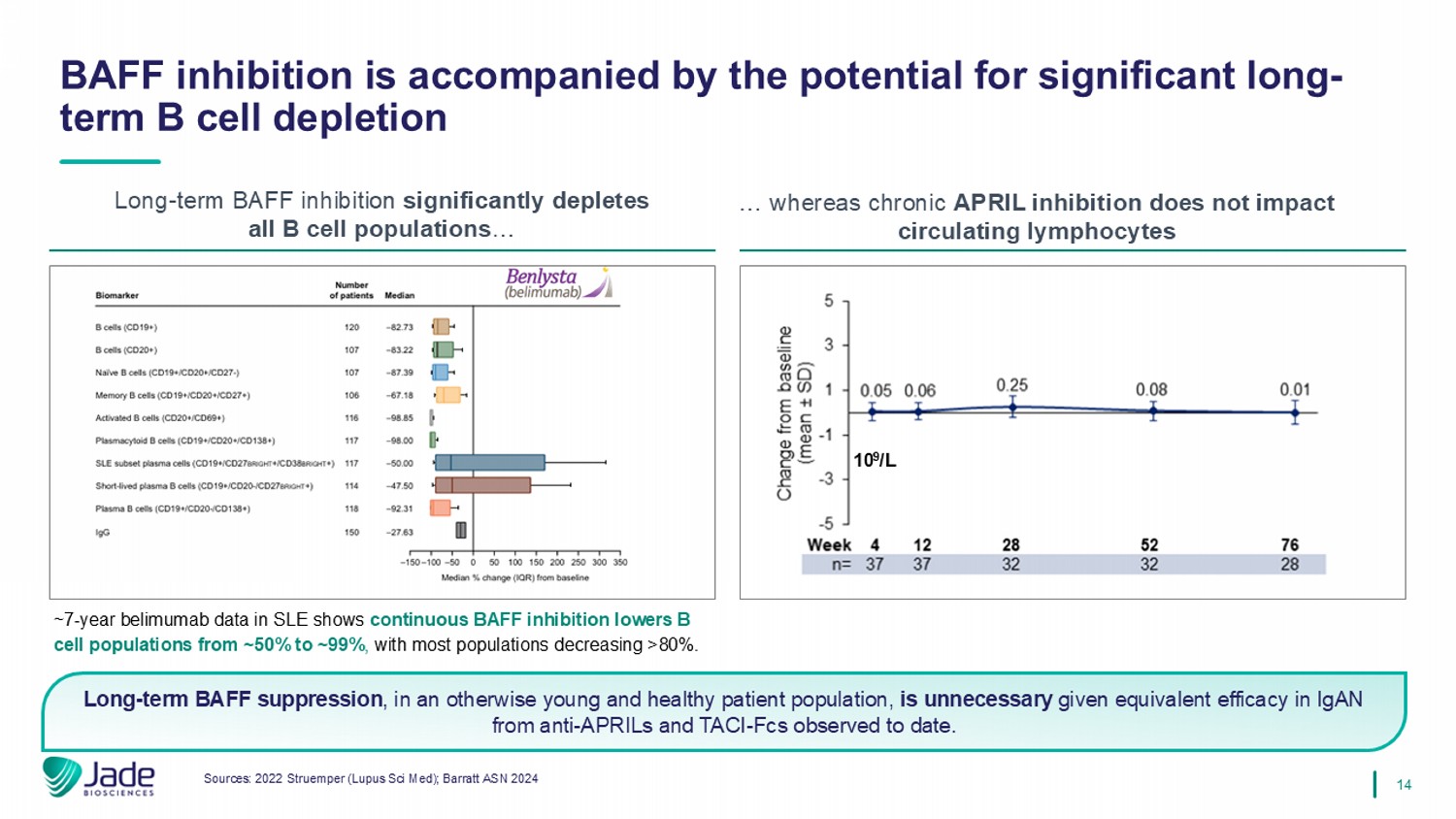 13 Povetacicept Atacicept Zigakibart Sibeprenlimab Engineered TACI - Fc TACI - Fc anti - APRIL anti - APRIL MoA P3 P3 P3 P3 Status N=9 (80 mg) N=32 (150 mg) N=35 (600 mg) N=79 (4/8 mg/kg pooled) Δ from baseline in critical disease markers (W36 timepoint*) ✓ (12 months) ✓ (24 months) ✓ (18 months) ✓ (12 months) GFR stabilization ✓ ✓ No data ✓ Hematuria resolution ✓ Well - tolerated (no pbo ) 240 mg ↑ infections ✓ Well - tolerated, slight ↑ in infections (& URTIs) vs. pbo ✓ Well tolerated (no pbo) , no drug discontinuations ✓ Well tolerated, no overall ↑ infections, slight ↑ in URTIs vs. pbo Safety 80 mg SC, Q4W 150 mg SC, QW 600 mg SC, Q2W 400 mg SC, Q4W P3 Dosing Anti - APRILs have shown evidence of disease modification and clinical activity that matches or beats TACIs, with reduced immune suppression IgA Gd - IgA1 UPCR 67% 60% 60% IgA Gd - IgA1 UPCR 64% 69% 53% IgA Gd - IgA1 UPCR 63% 64% 33% IgA Gd - IgA1 UPCR 65% 69% 59% Notes: *Zigakibart IgA / Gd - IgA data at W40; UPCR data at W52 (only timepoint available); change from baseline is not pbo - controlled; N represents patients on dose(s) for which data is shown. Atacicept infections/URTIs placebo - (32%/0%), 25 mg (38%/0%), 75 mg (49%/9%), 150 mg (39%/6%). Povetacicept infection rates: Grade 1/2/≥3 – 80 mg 10%/5%/0%, 240 mg 18%/27%/3%. Sibe infections/URTIs placebo - (55%/0%), 2 mg/kg (39.5%/8%), 4 mg/kg (56%/12%), 8 mg /kg (53%/5% Sources: 2023 Mathur (NEJM); 2024 Barratt (ERA Presentation); VERA January 2024 R&D Day; ALPN 2024 WCN Investor Update; 2024 Mad an (ASN Presentation)