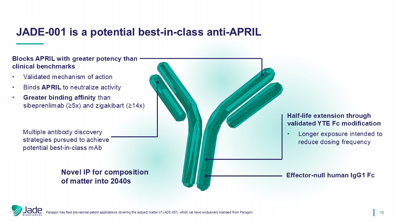 15 JADE - 001 is a potential best - in - class anti - APRIL Blocks APRIL with greater potency than clinical benchmarks • Validated mechanism of action • Binds APRIL to neutralize activity • Greater binding affinity than sibeprenlimab (≥5x) and zigakibart (≥14x) Effector - null human IgG1 Fc Half - life extension through validated YTE Fc modification • Longer exposure intended to reduce dosing frequency Paragon has filed provisional patent applications covering the subject matter of JADE - 001, which we have exclusively licensed fr om Paragon. Multiple antibody discovery strategies pursued to achieve potential best - in - class mAb Novel IP for composition of matter into 2040s